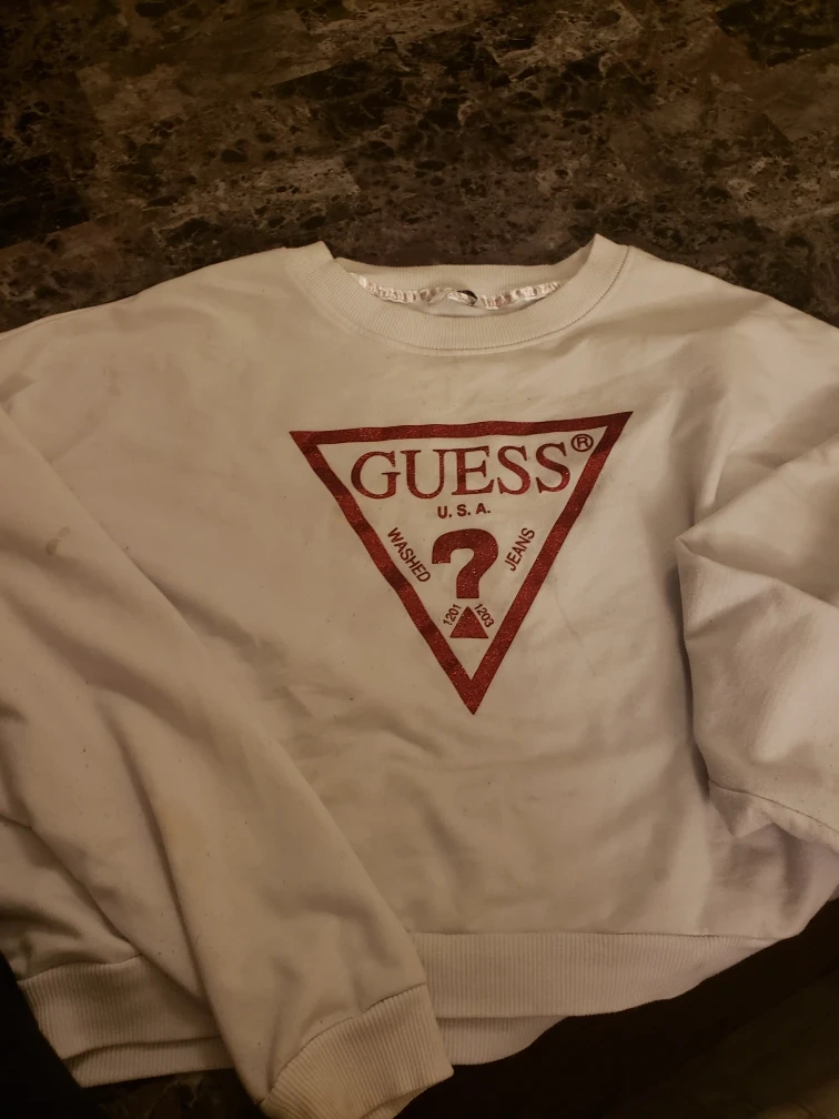 White Guess cropped sweatshirt with a red glittery logo. Long sleeves, crew neck. Few spots here and there, would be a good craft/painting/camping shirt or a child's smock