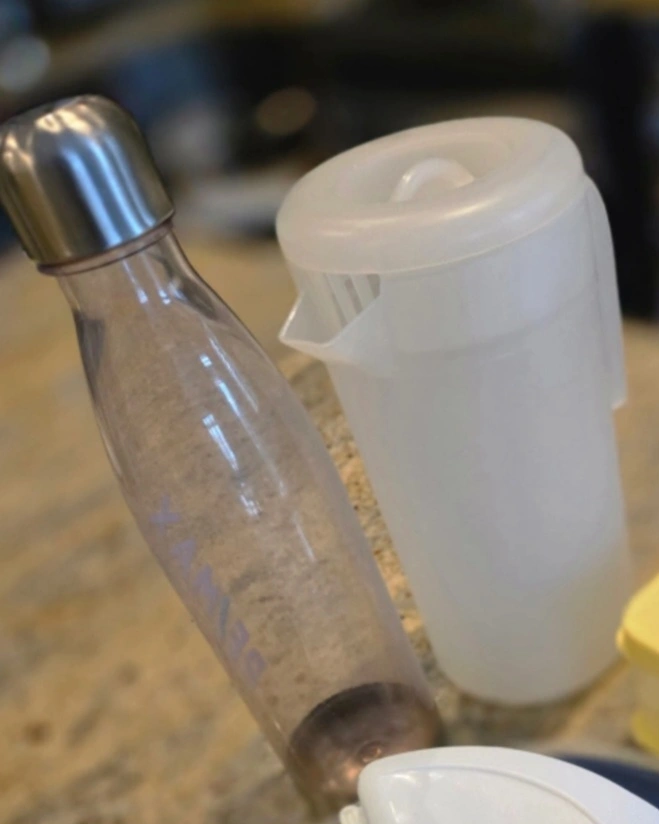 Water bottle, clear pitcher.