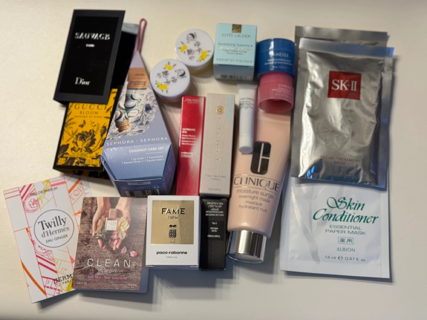 510Bundle include: 1. SK-II facial treatment mask (2); 2. Albion paper mask (2); 3. Clinique moisture surge overnight mask (100 ml); 4. Sephora coconut care set (1 lip balm and 1 hand balm); 5. Japanese Lip balm (2); 6. Laneige water sleeping mask (15 ml); 7. Laneige lip sleeping mask (3 gram); 8. Estée Lauder revitalizing supreme + crème (5 ml); 9. Tatcha tonic (25 ml); 10. Shiseido ultimune eye concentrate (5ml); 11. Shiseido benefiance wrinkle smoothing eye crème (5ml); 12. Various sample perfumes.