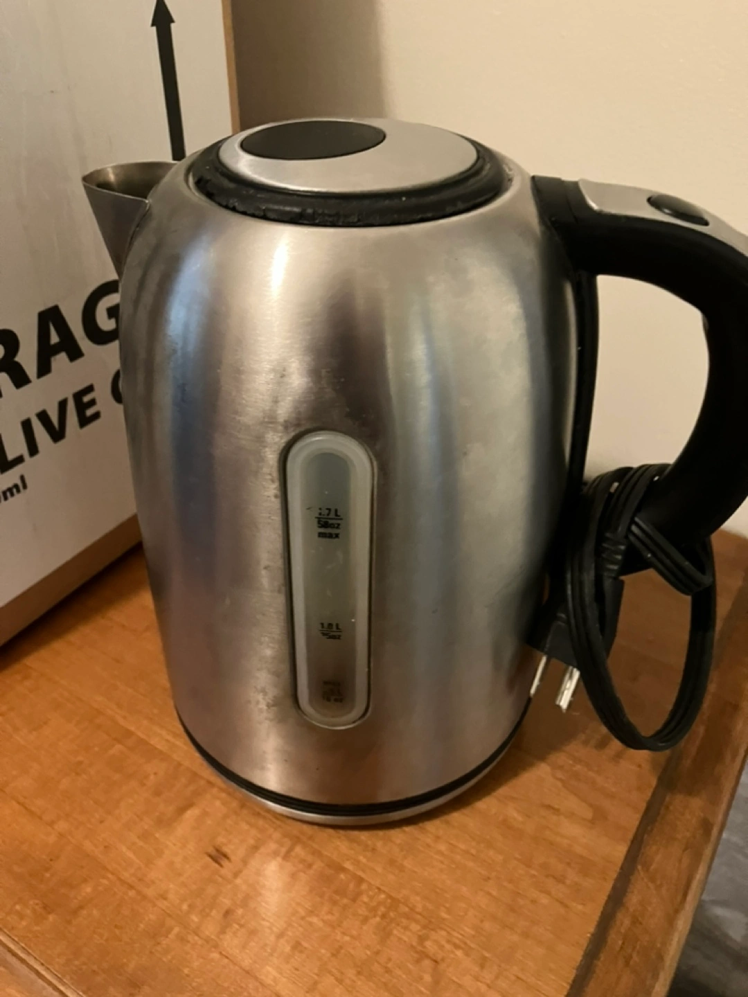 On button tab is broken but you can still turn it on, see second photo. Stainless steel electric kettle with a 1.7L capacity. Includes a cord and power plug.