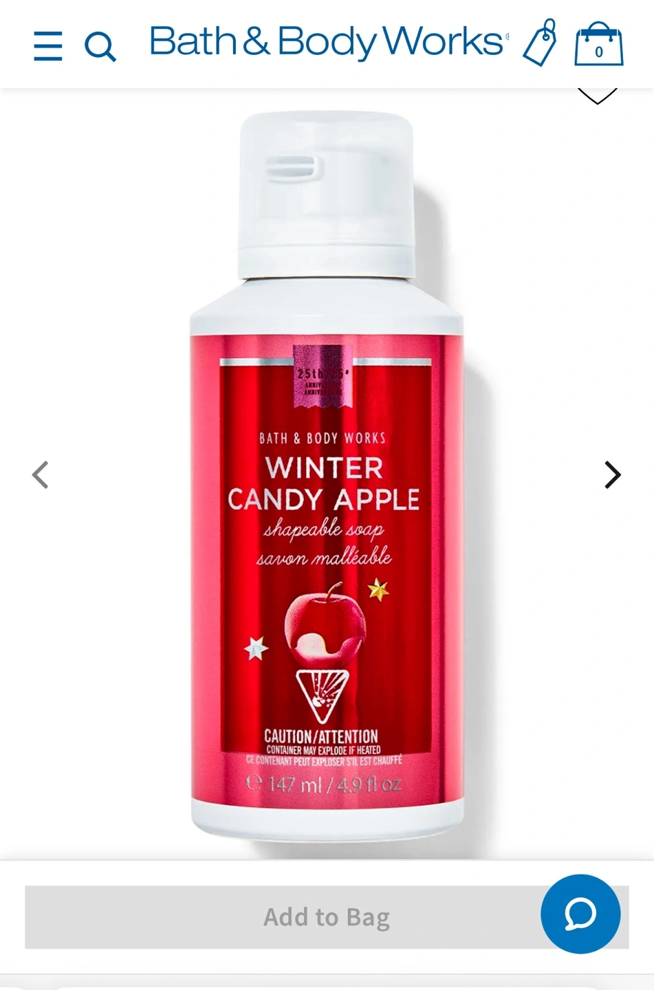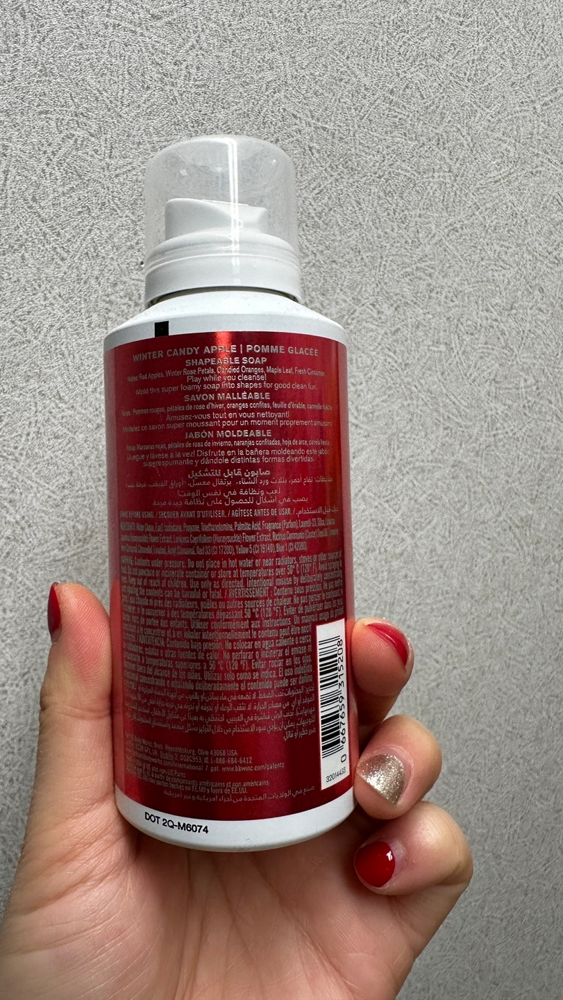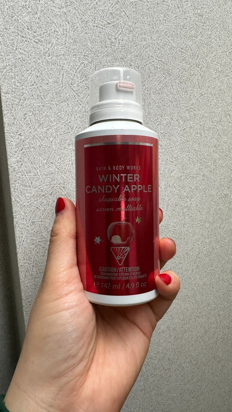 This is a winter special Bath & Body Works’ shapeable soap in Winter Candy Apple scent. This is used item; used one pump. Fragrance notes are red apples, winter rose petals and candied oranges. If you wish to have your bath time smell like sweet candy apples, then you’ll love this scent. Squeeze out the foamy soap onto your hand, then mold it into shapes. The foam will diminish as time passes. It makes your shower or bath time much fun! Retail price: $20.50 4.9 fl oz / 147 mL
