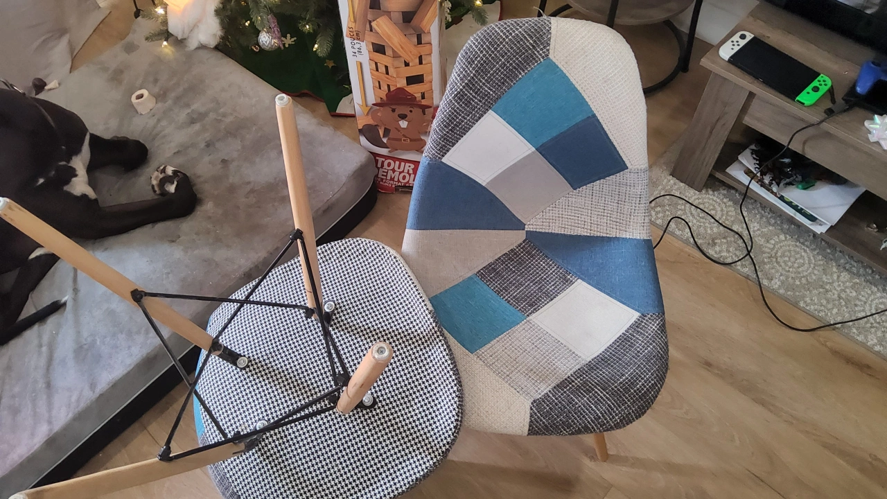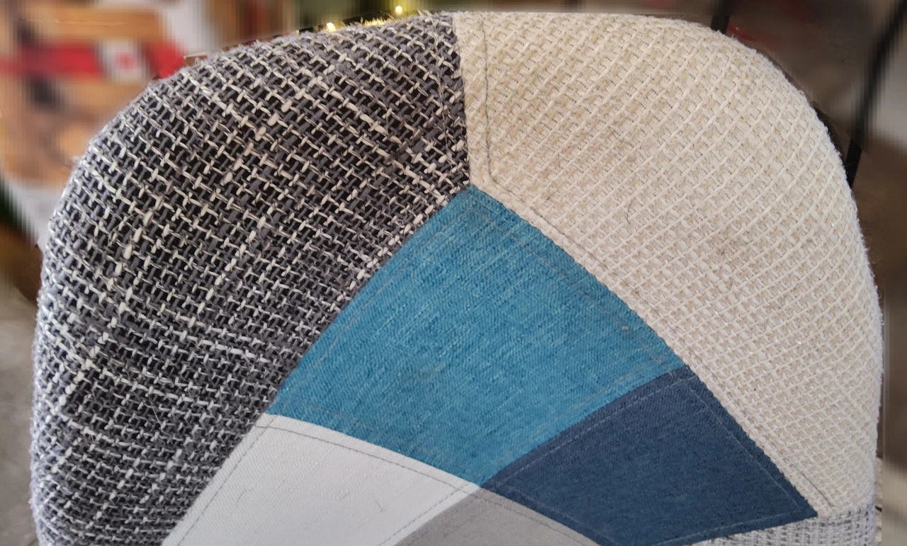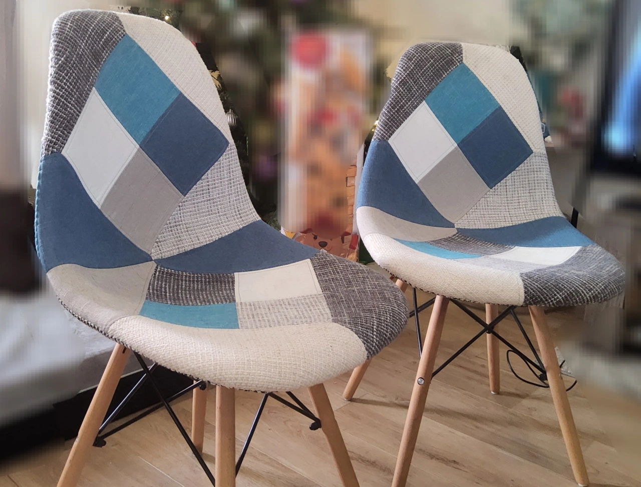 Four side chairs with wooden legs and a patchwork fabric seat. Blue, grey, and white fabric. Used-good condition. Will be like new after a cleaning. $15 each or 4 for $50.