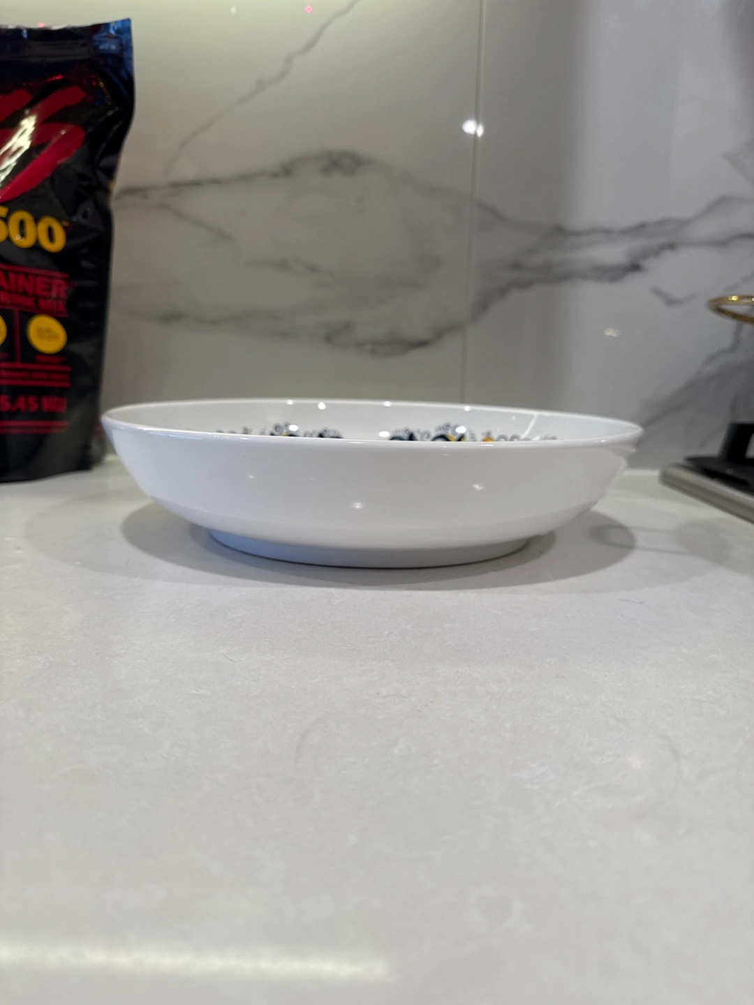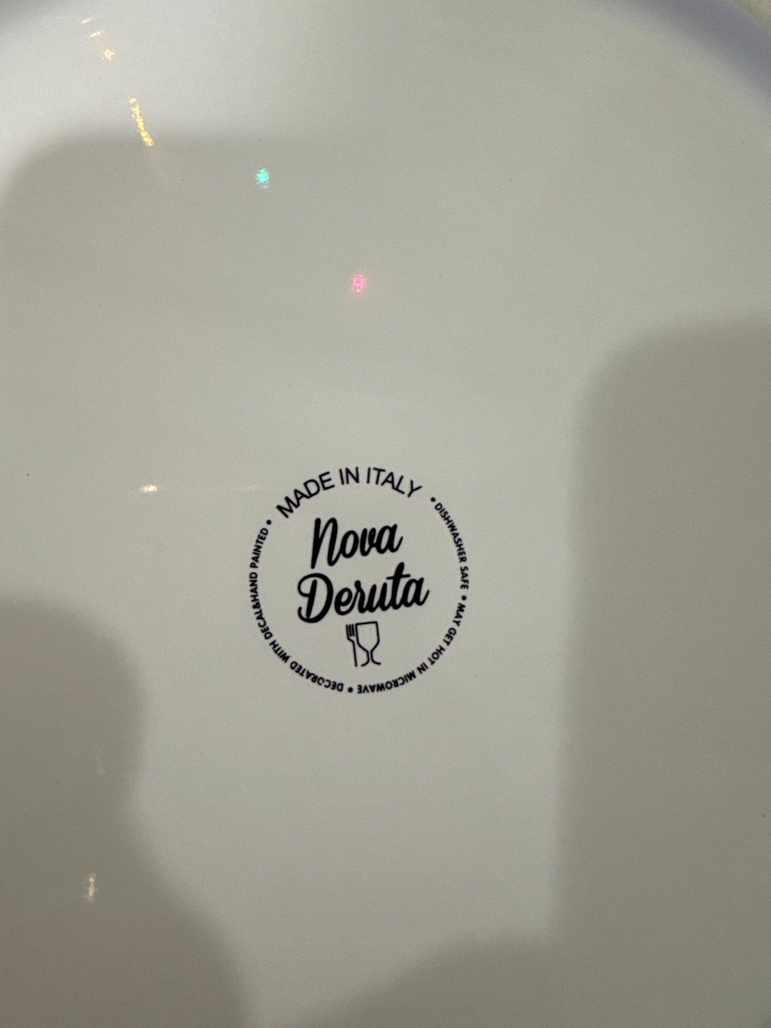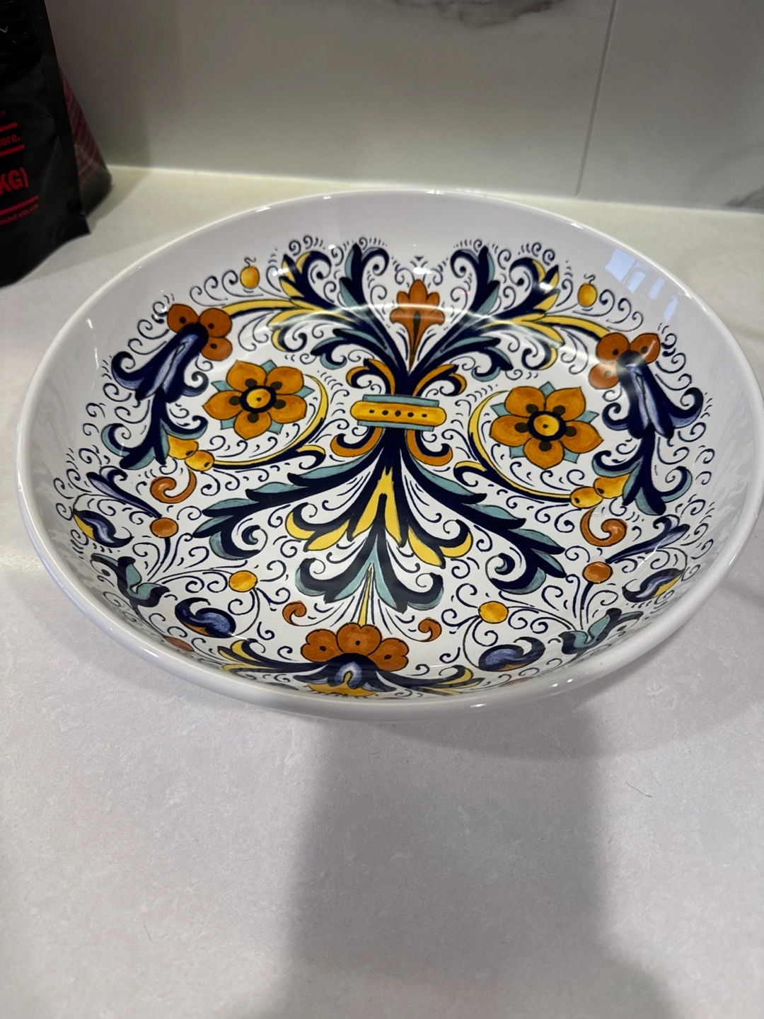Used once . Large ceramic bowl with blue, yellow and orange floral pattern. Made in Italy.