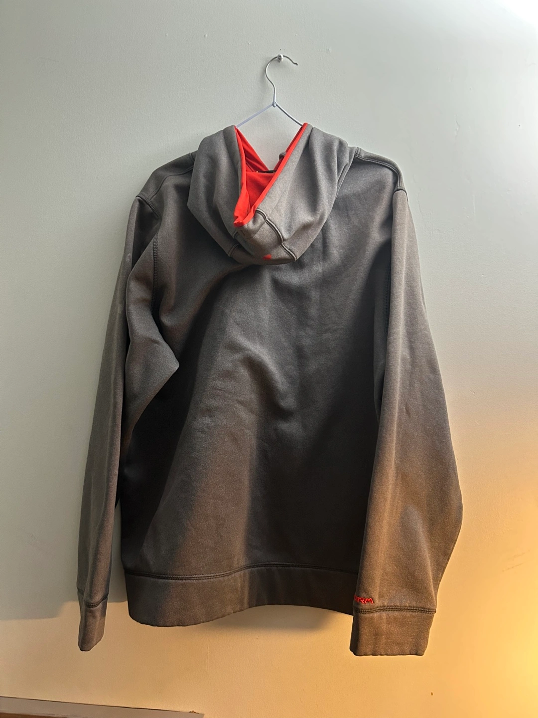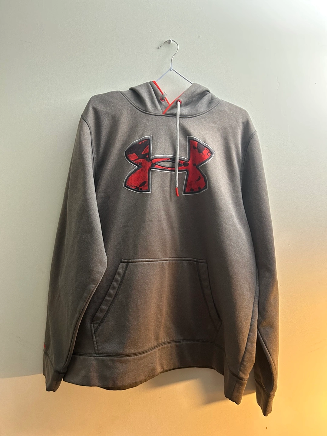 Grey hoodie with red accents and Under Armour logo. Long sleeves and a hood.