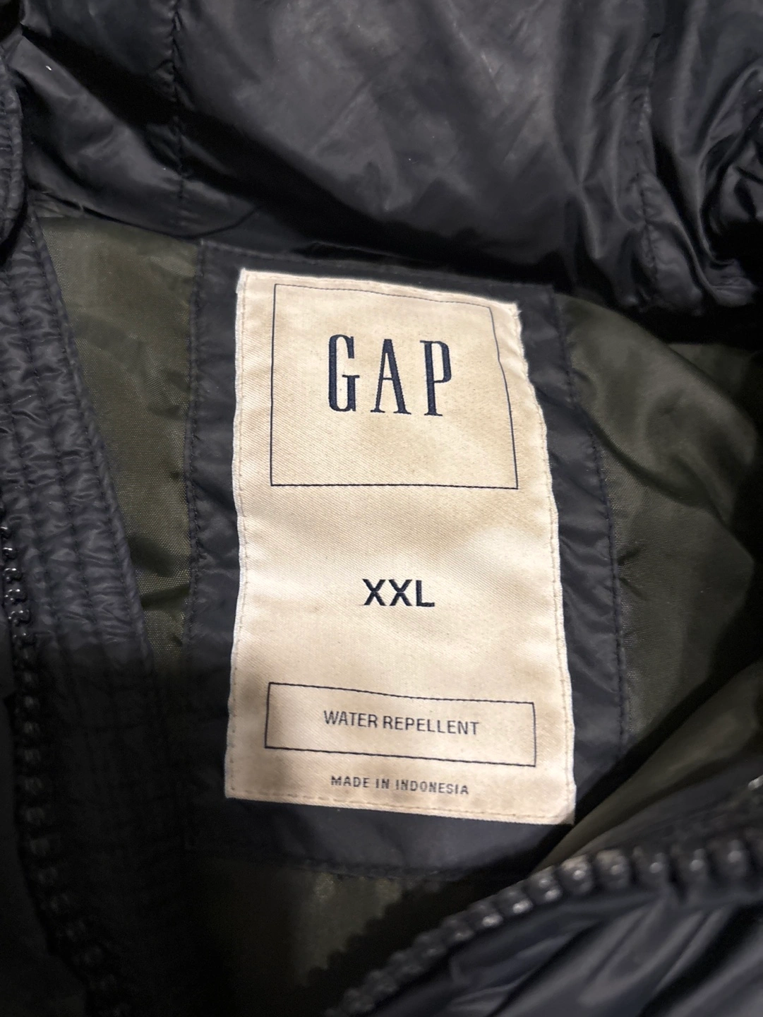 Black puffer jacket with a hood. Water repellent. Size XXL. Made in Indonesia.