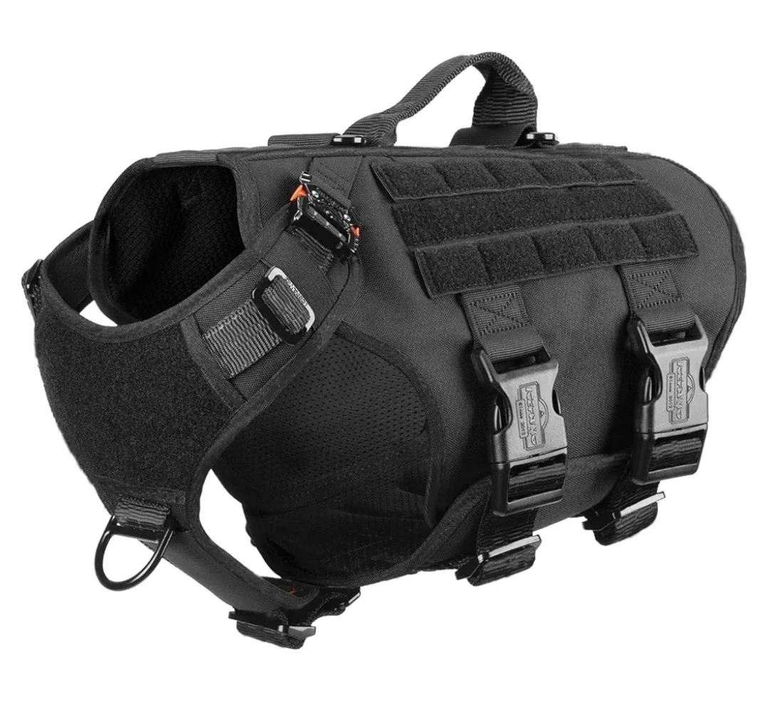 Black Tactical Dog Harness with utility bags.