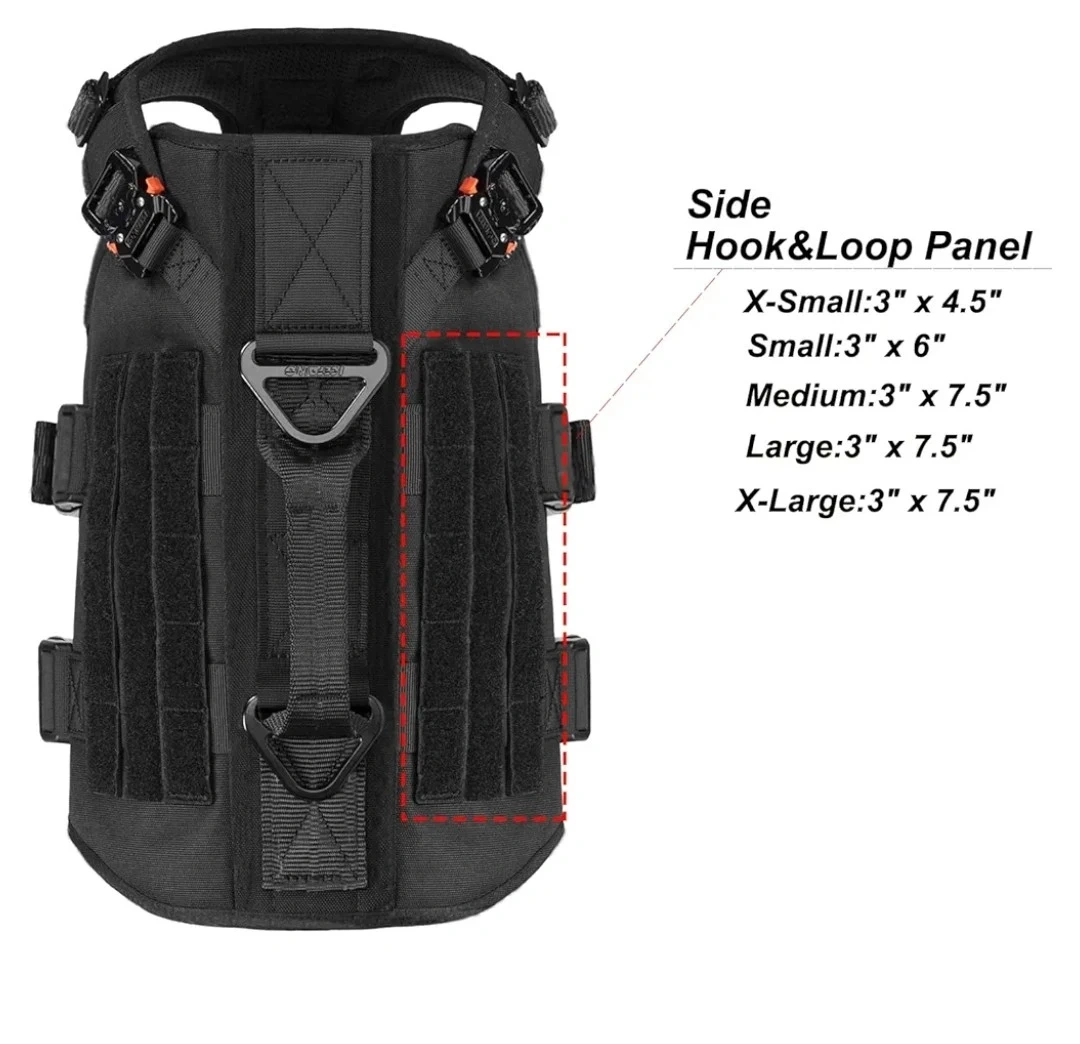This black tactical dog harness features side hook & loop panels for customization. It includes a sturdy handle and multiple attachment points for leashes and gear. Available in sizes X-Small (3" x 4.5") to X-Large (3" x 7.5").