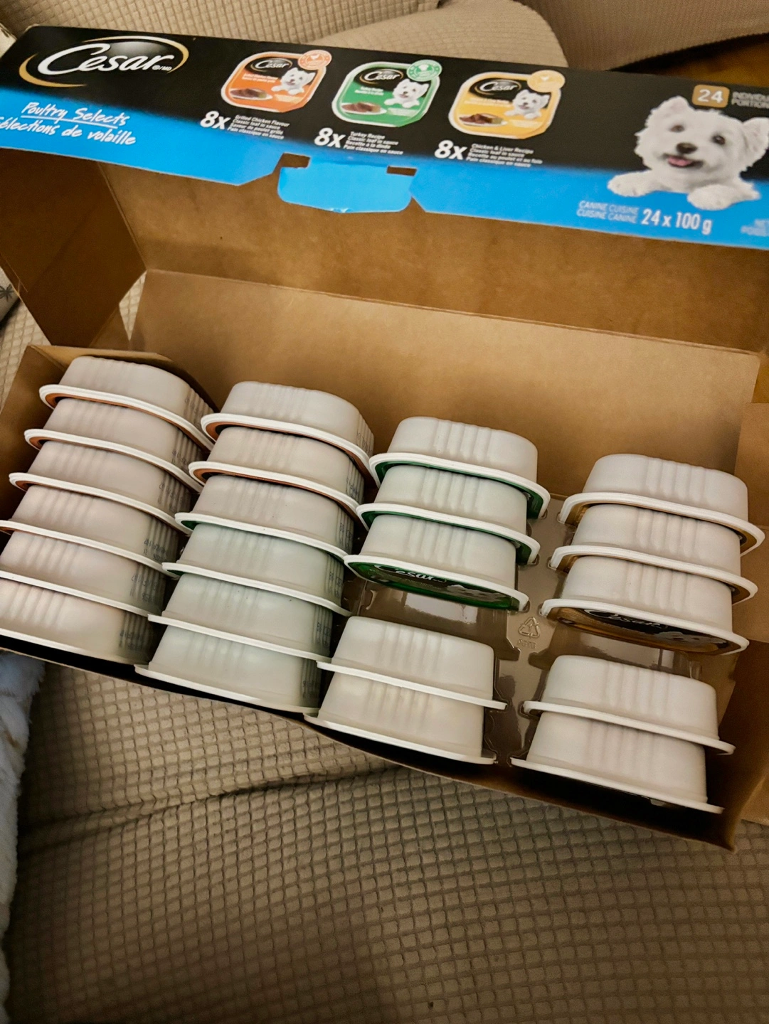 21 left - wet dog food. Three flavours: Chicken & Liver, Savoury Chicken, and Turkey & Vegetables.