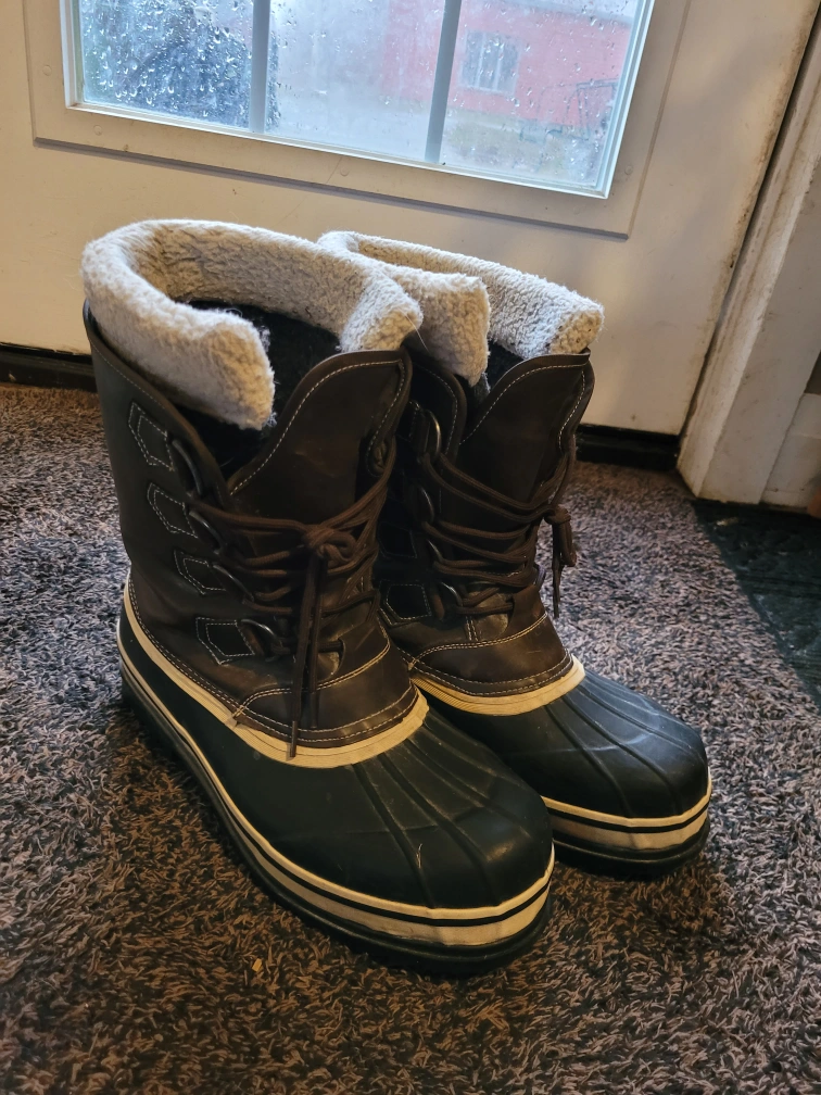 75Brown winter boots with black rubber bottoms and white trim. Faux fur lining.