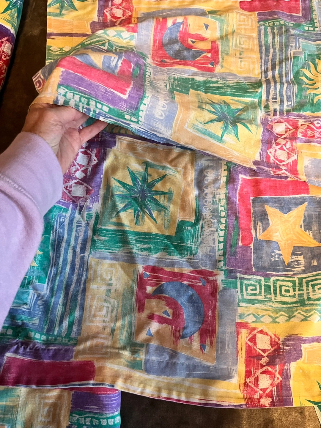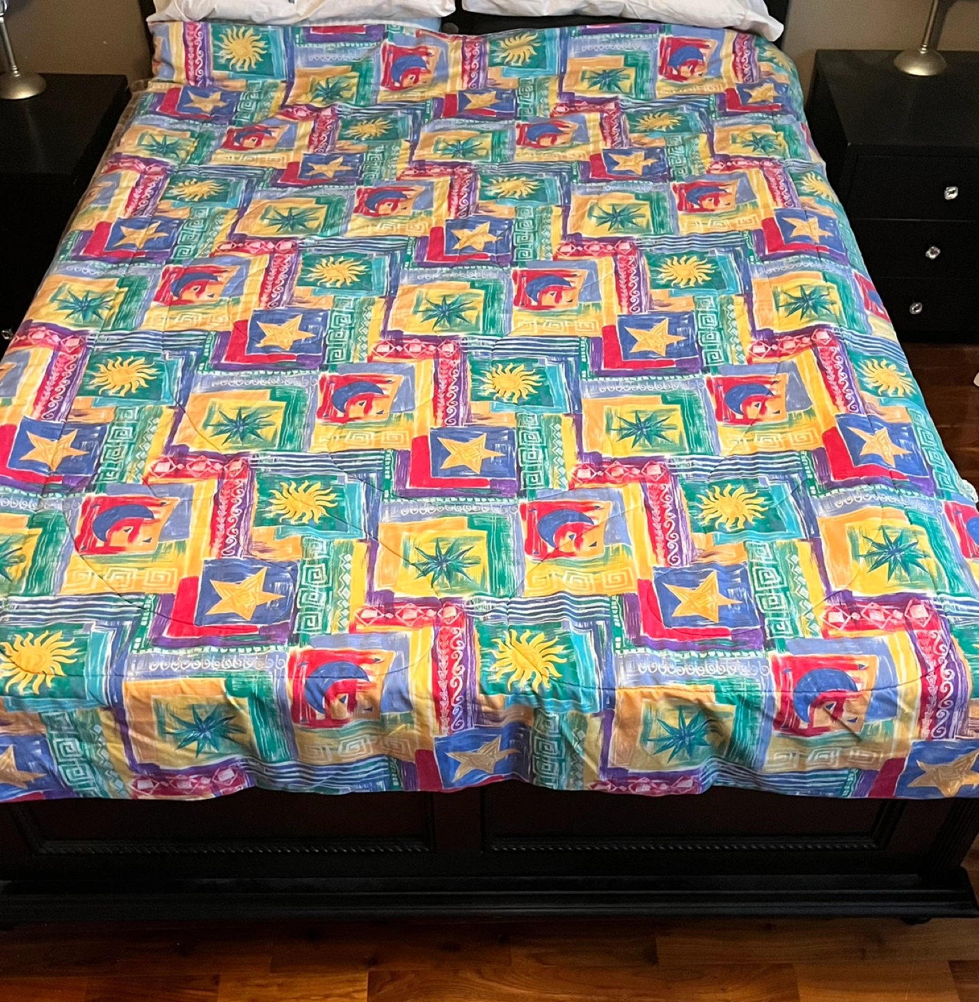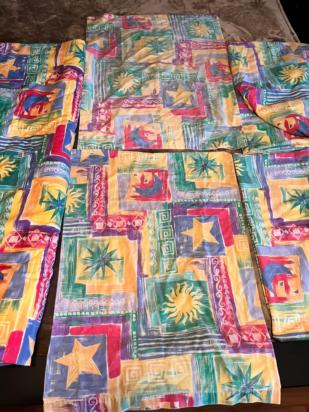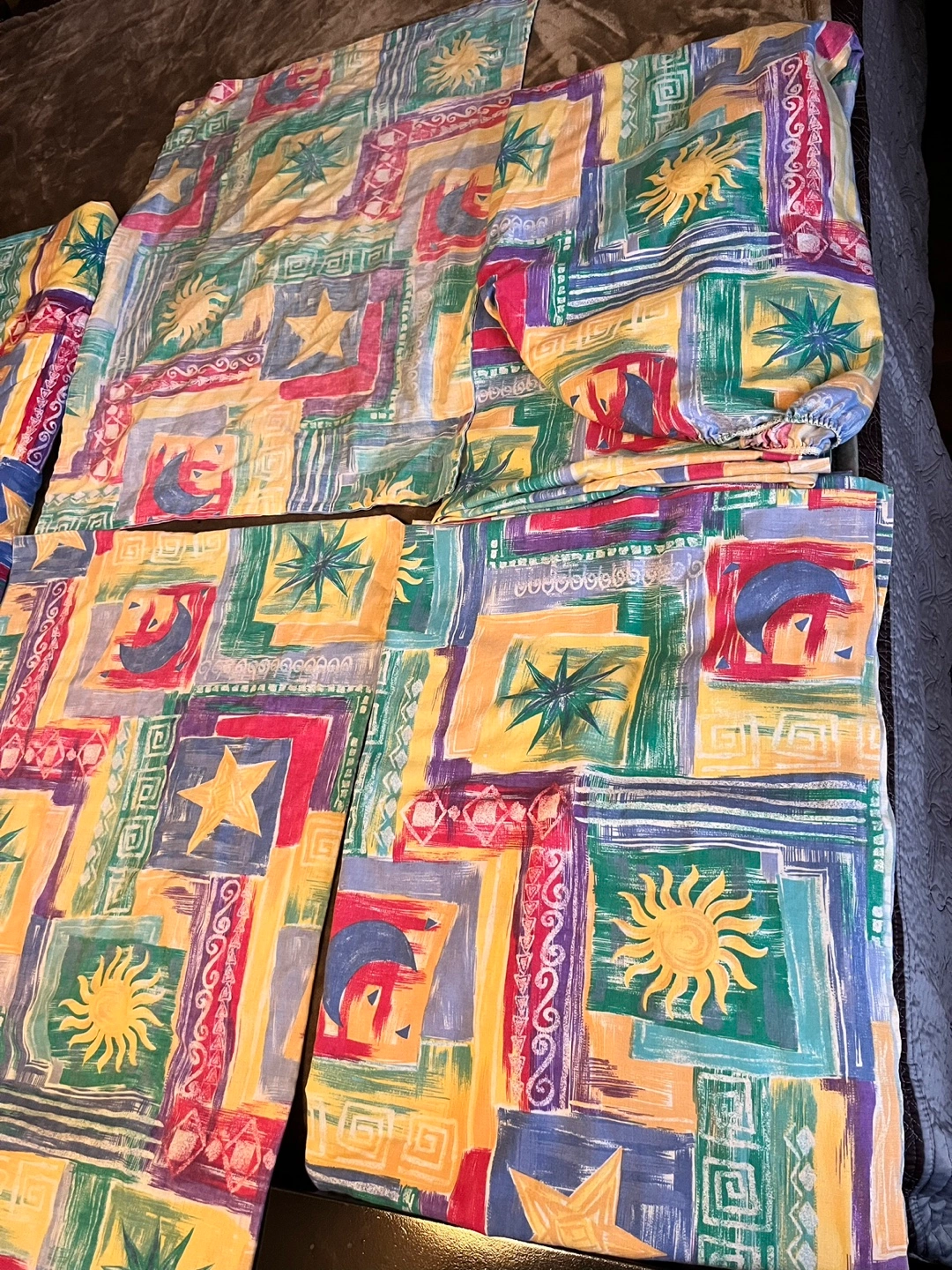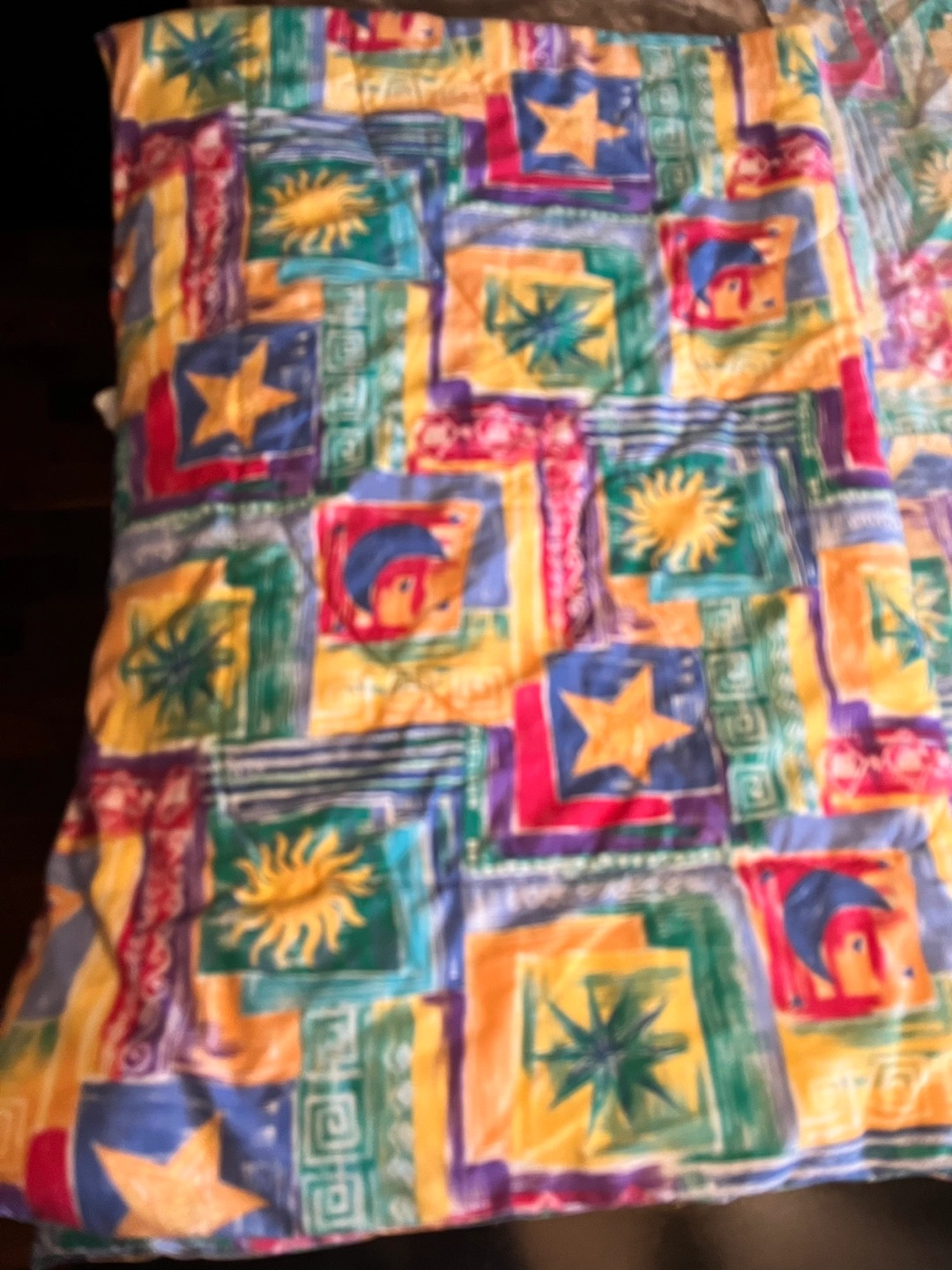 80Twin Comforter and Sheet set. Multicolored patchwork design. Sun, moon and star motifs. Excellent condition comforter. Matching twin sheet set has fitted and flat sheet, one pillow sham, and one pillow case. The fitted sheet will not fit a deep twin mattress. Comforter is shown on a Queen bed. Pick up Brock and Taunton in Whitby. YES, it’s available…