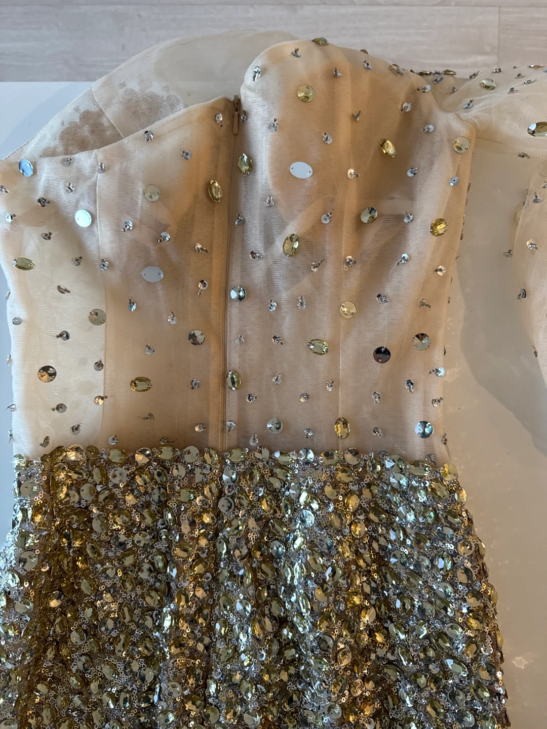 Worn once, some beads have fallen off but not noticeable. One-shoulder, long sleeve gown with a mermaid silhouette. It has a sheer bodice with embellishments throughout.