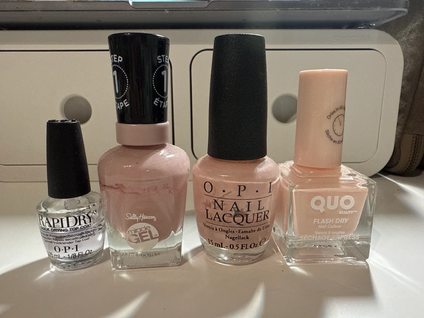 Four bottles of nail polish, including top coat, gel polish and regular nail polish. All are pink, but different shades. Sally Hansen and Quo are almost full, OPI is half full.