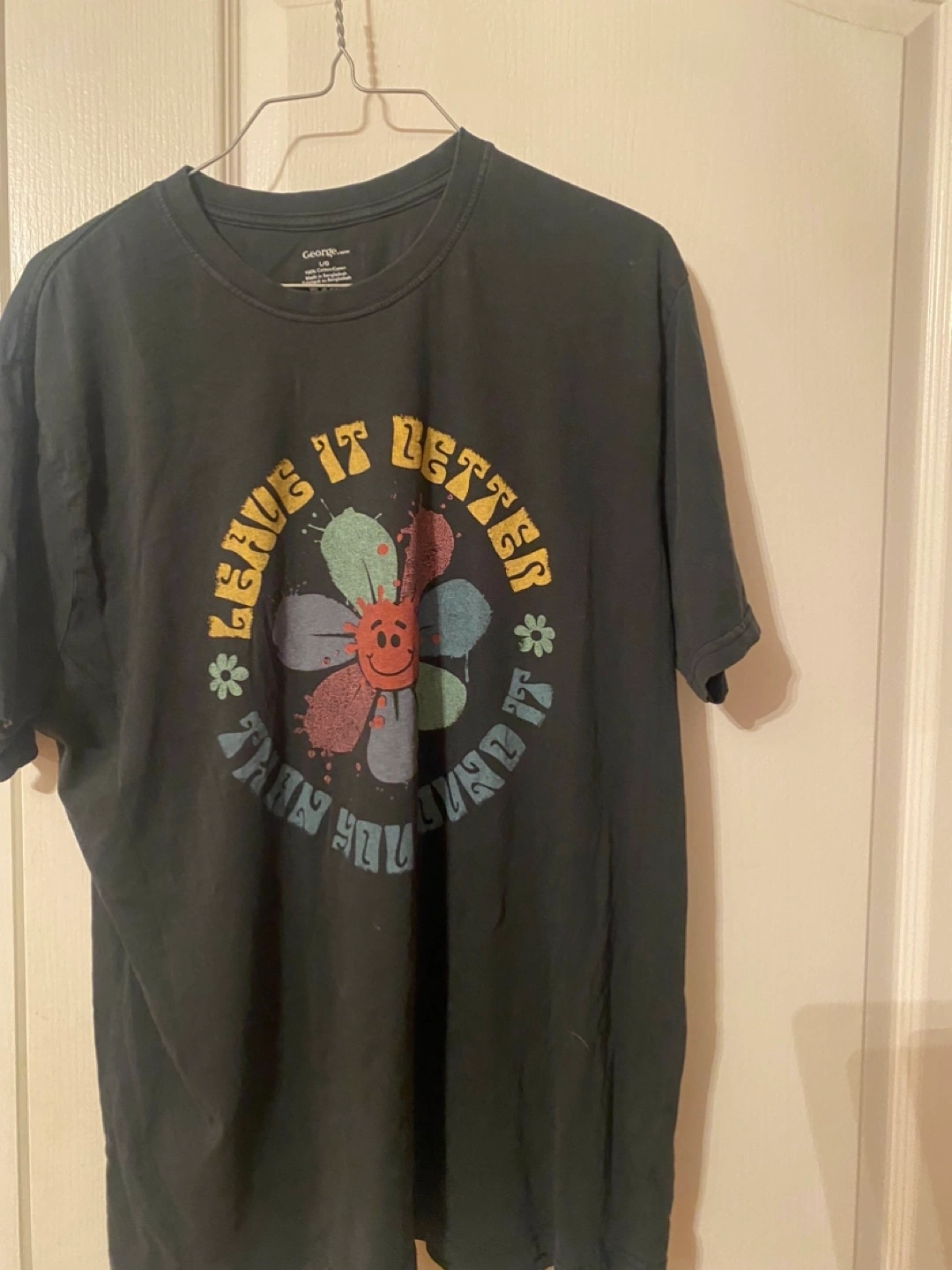 9Men's short sleeve T-shirt with a colourful graphic of a flower on the front. It has a crew neck and is a regular fit. The tag says 'Leave it Better Than You Found it'.