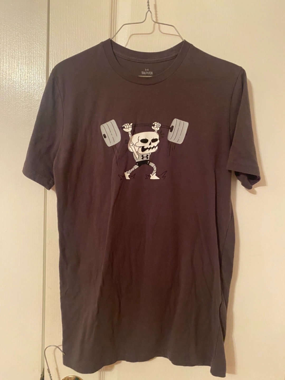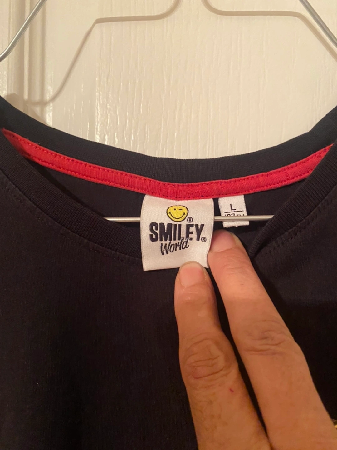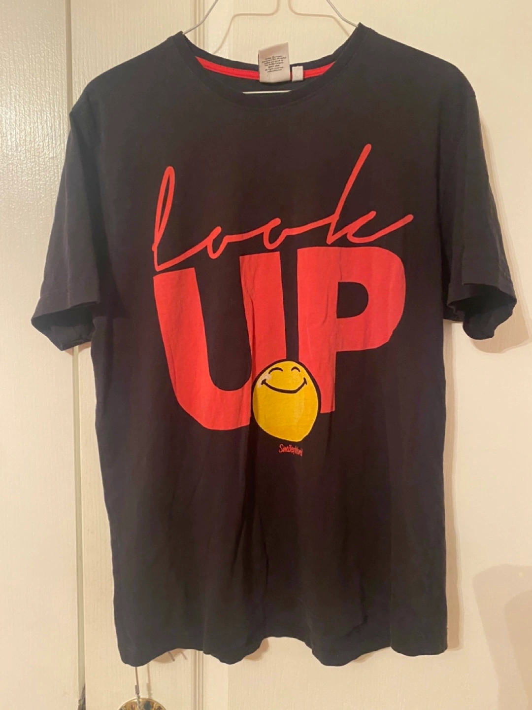 9Smiley World T-shirt with a red and black design. A smiling face with the words "look up" in red are on the front of the shirt.