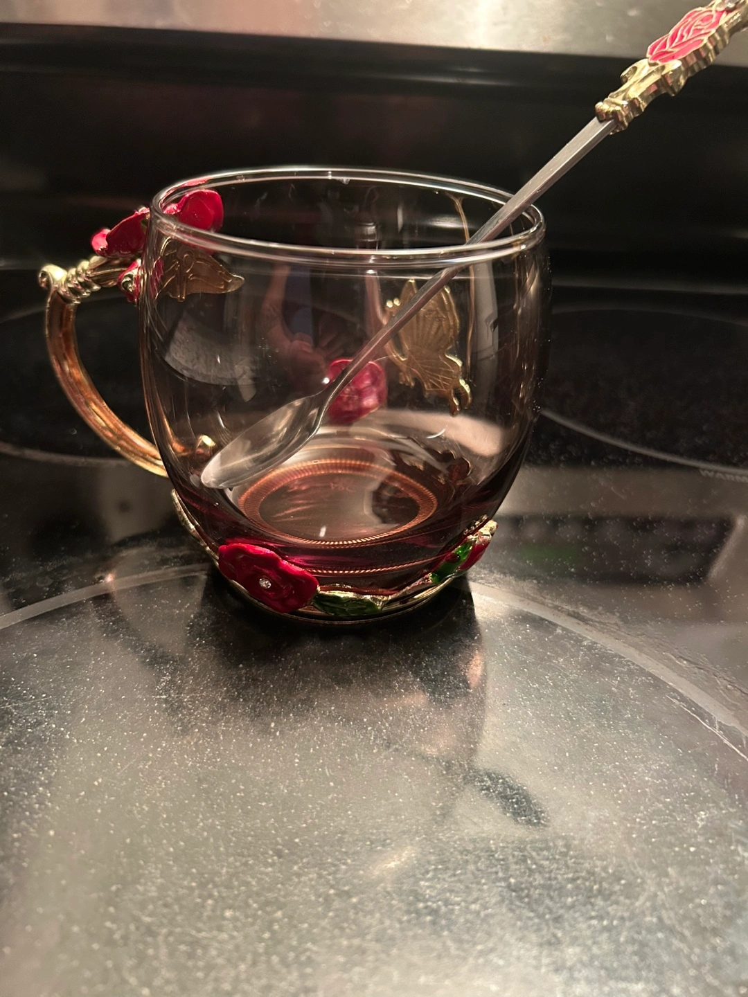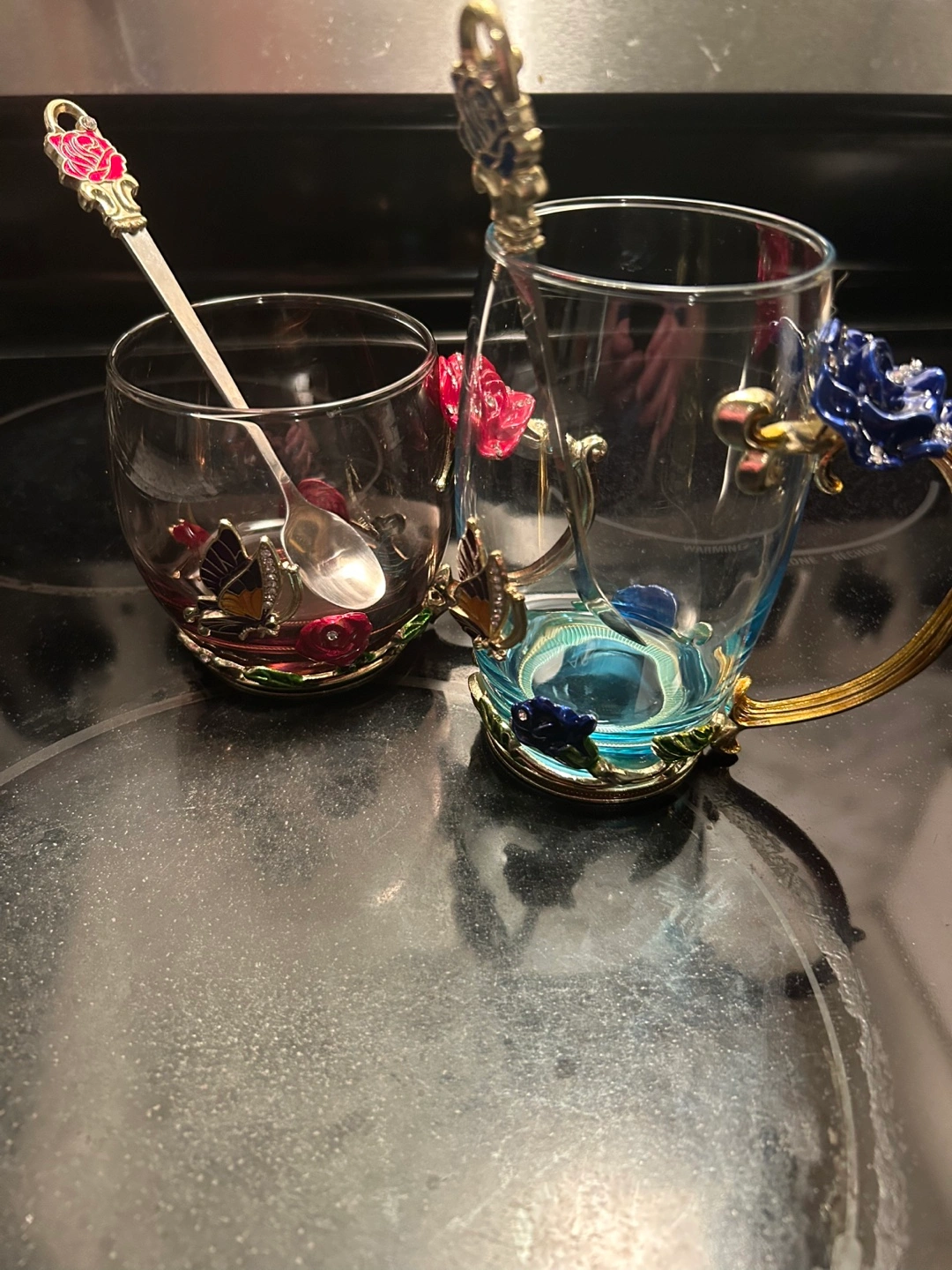 2 Glass mugs/Tea cups, red and blue in colour. $10 for both (or best offer)//pickup in the Killarney area.