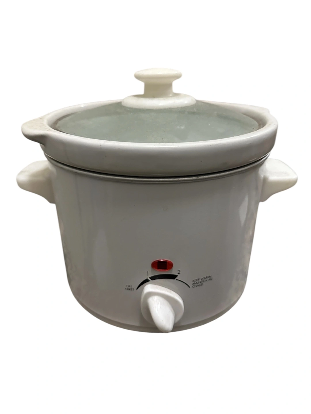 Small white crock pot with a glass lid. It has two settings: low and high, as well as a keep warm setting.