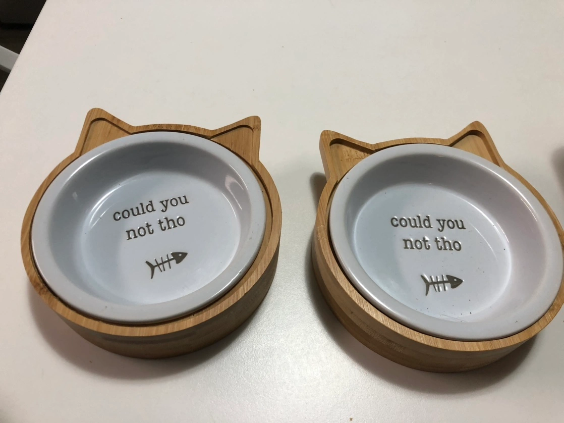 Set of two ceramic cat bowls with a wooden rim shaped like cat ears. The bowls have a white glaze with the saying "could you not tho" and a small fish bone design.$10 thanks.