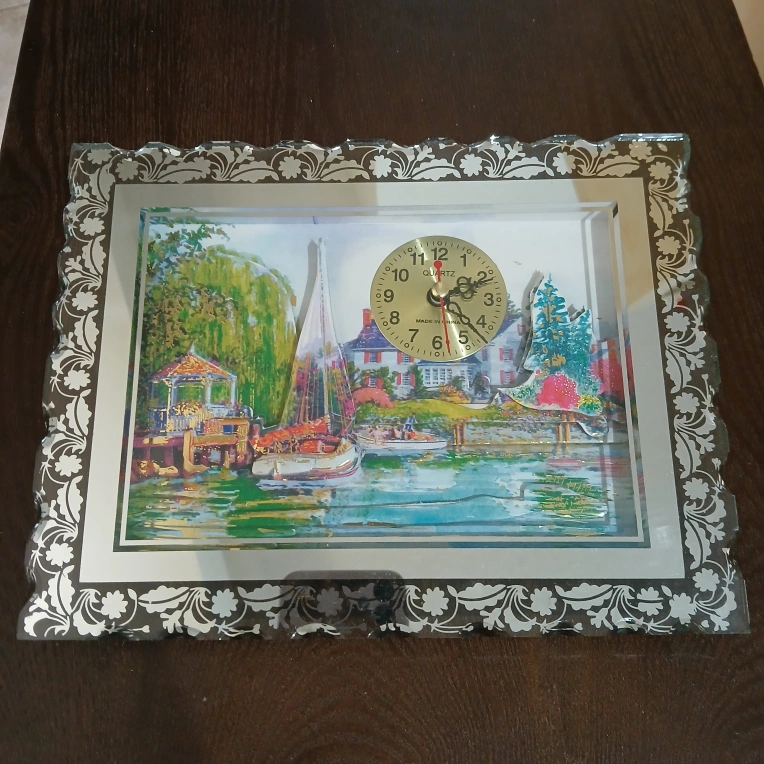 197A scenic picture encased in glass containing a battery-operated clock and framed with a decorative border. The clock no longer works but can still be a nice decorative piece.