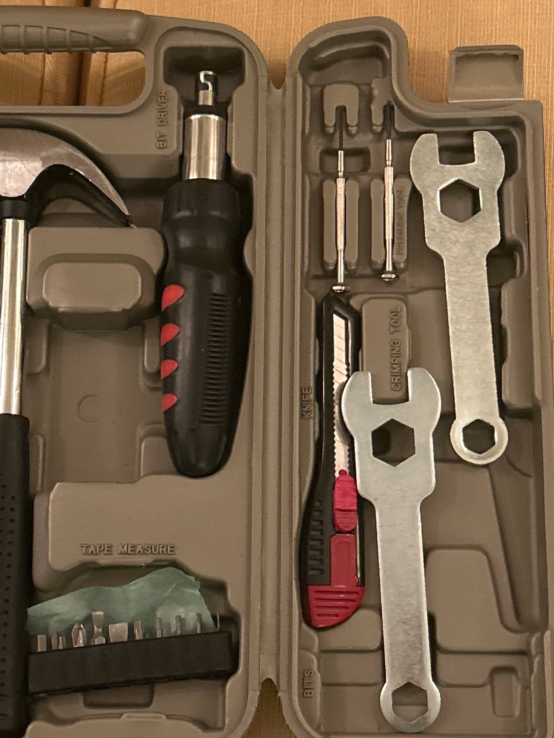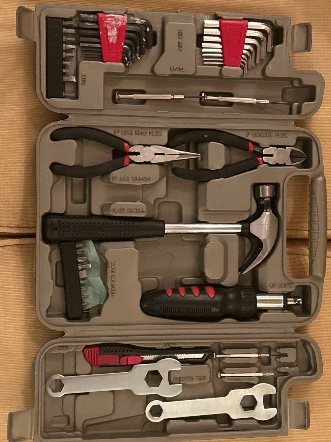 Set includes various tools: screwdrivers, wrenches, pliers, hex keys and hammer. Comes in a hard plastic case with handle.