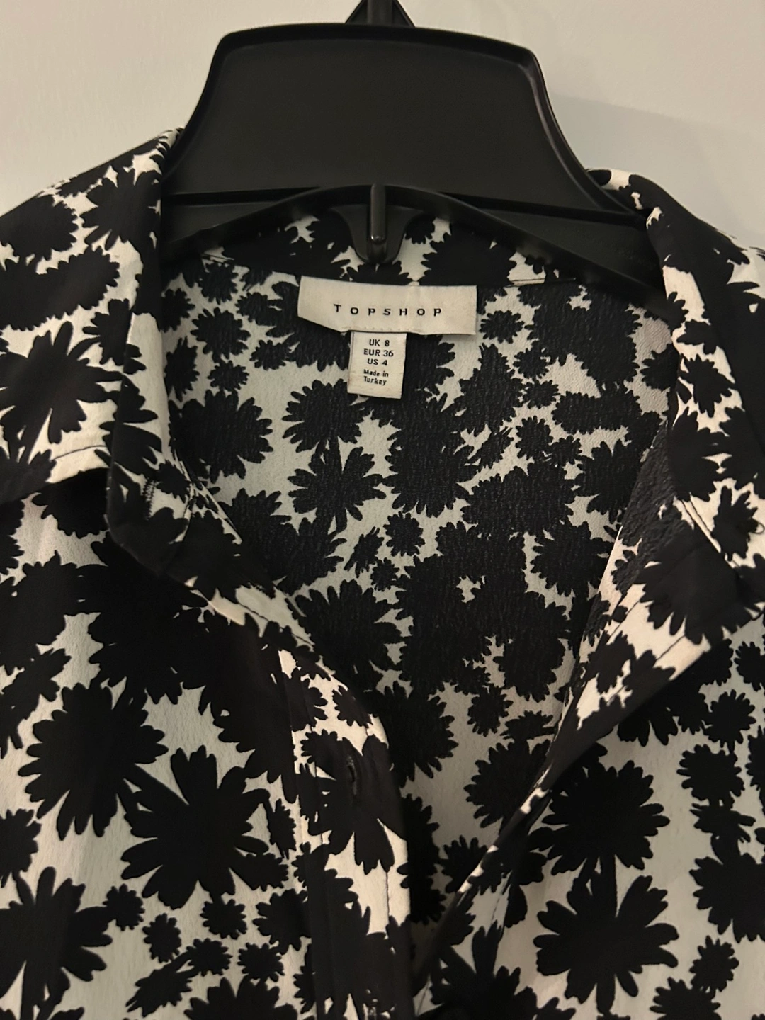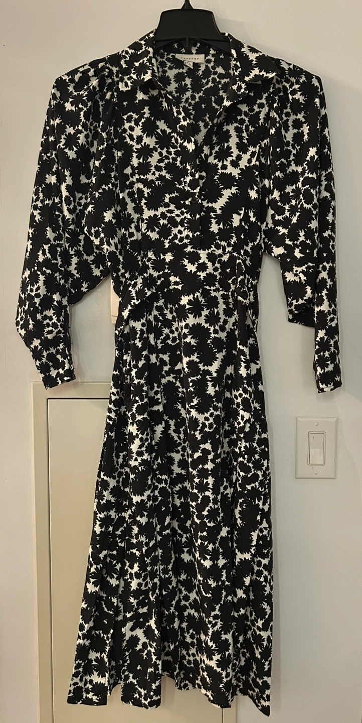 399Monochrome pull over dress Buttoned above waist with thick waist band and tie bands on the waist In perfect condition Beautiful transitional dress for all seasons