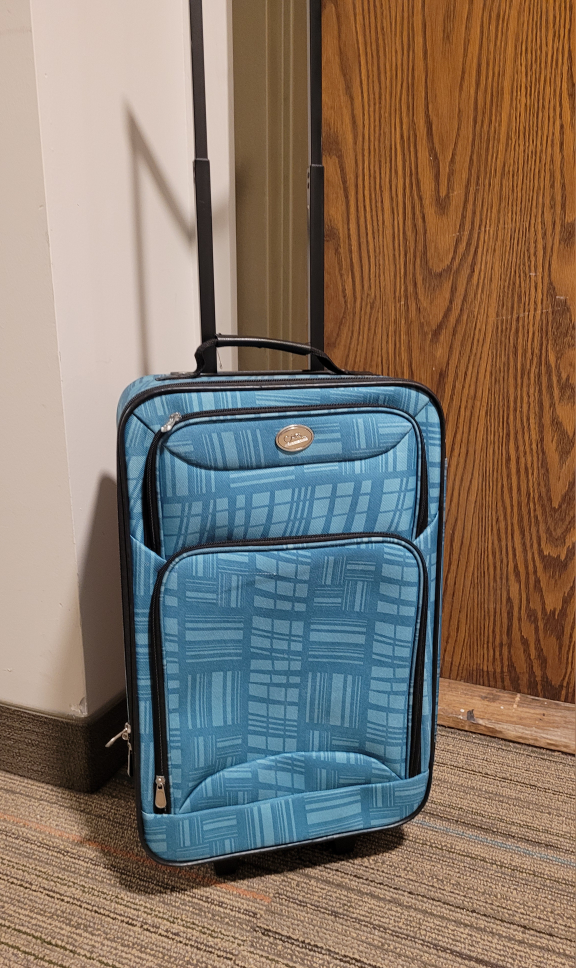 Blue carry-on suitcase with wheels. Has a retractable handle.