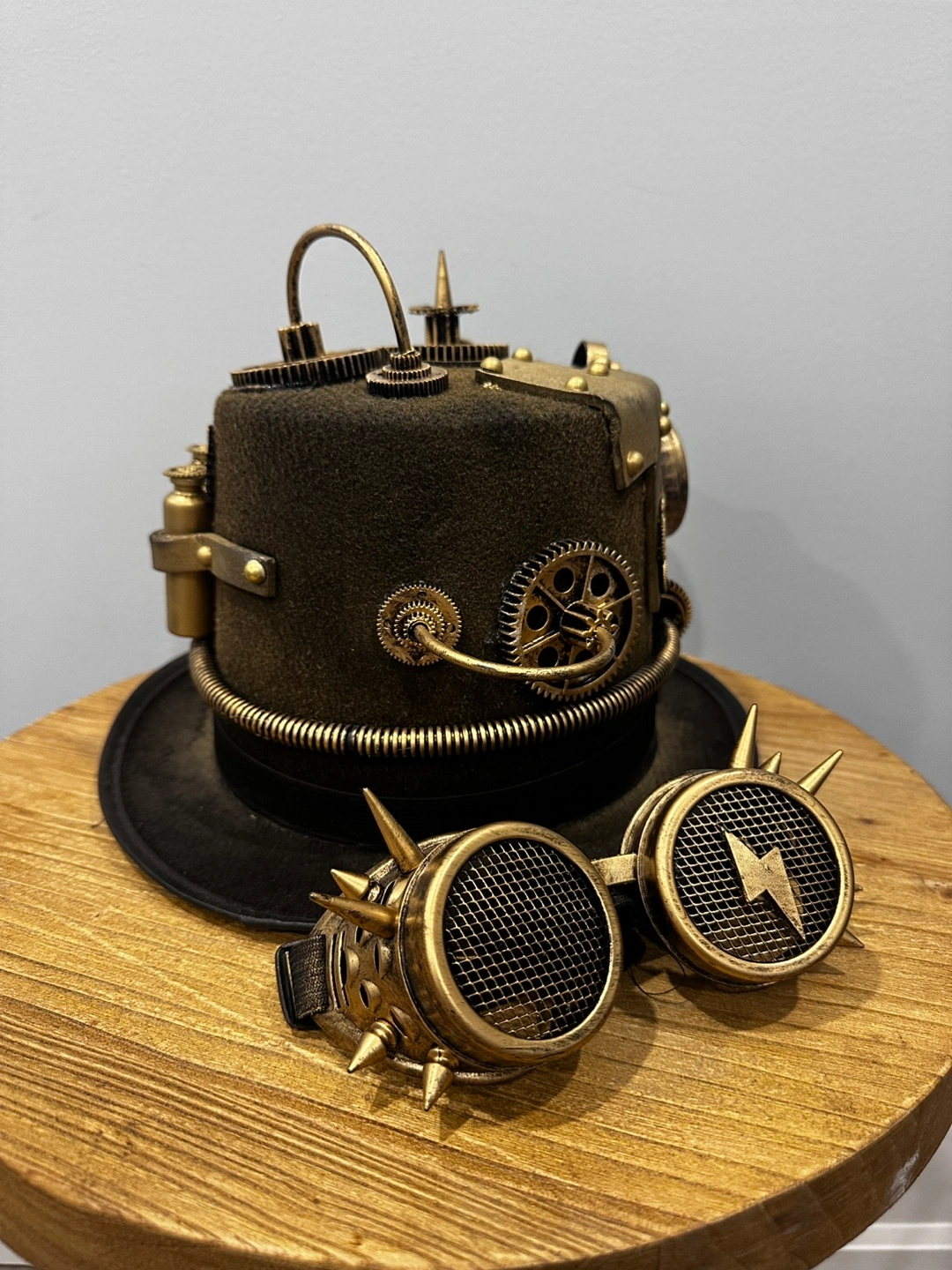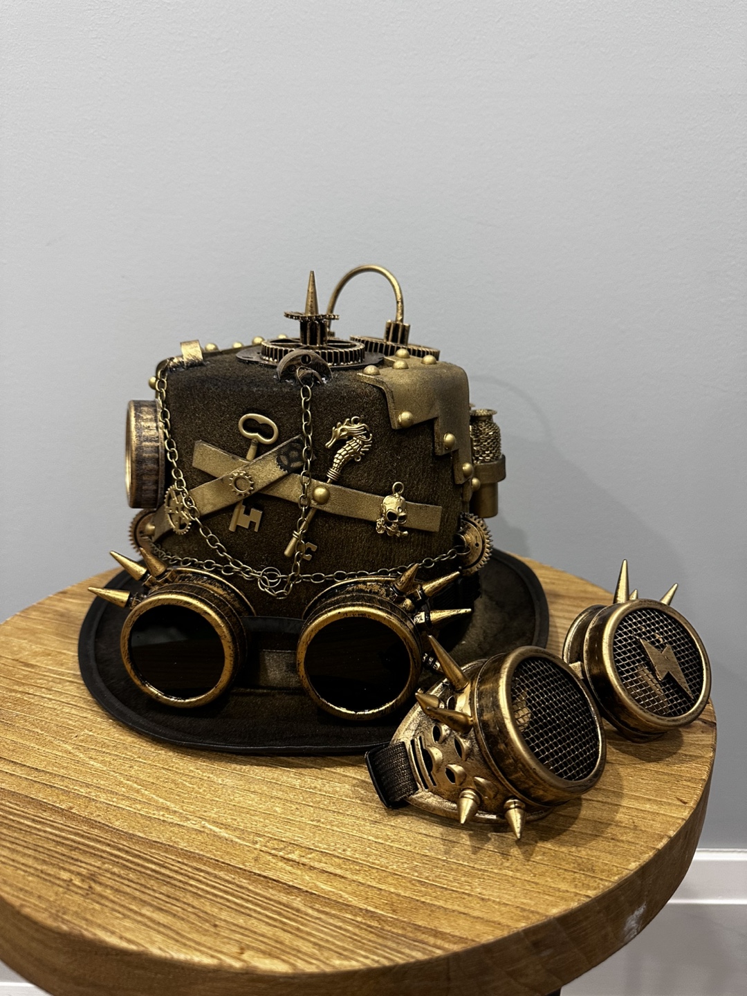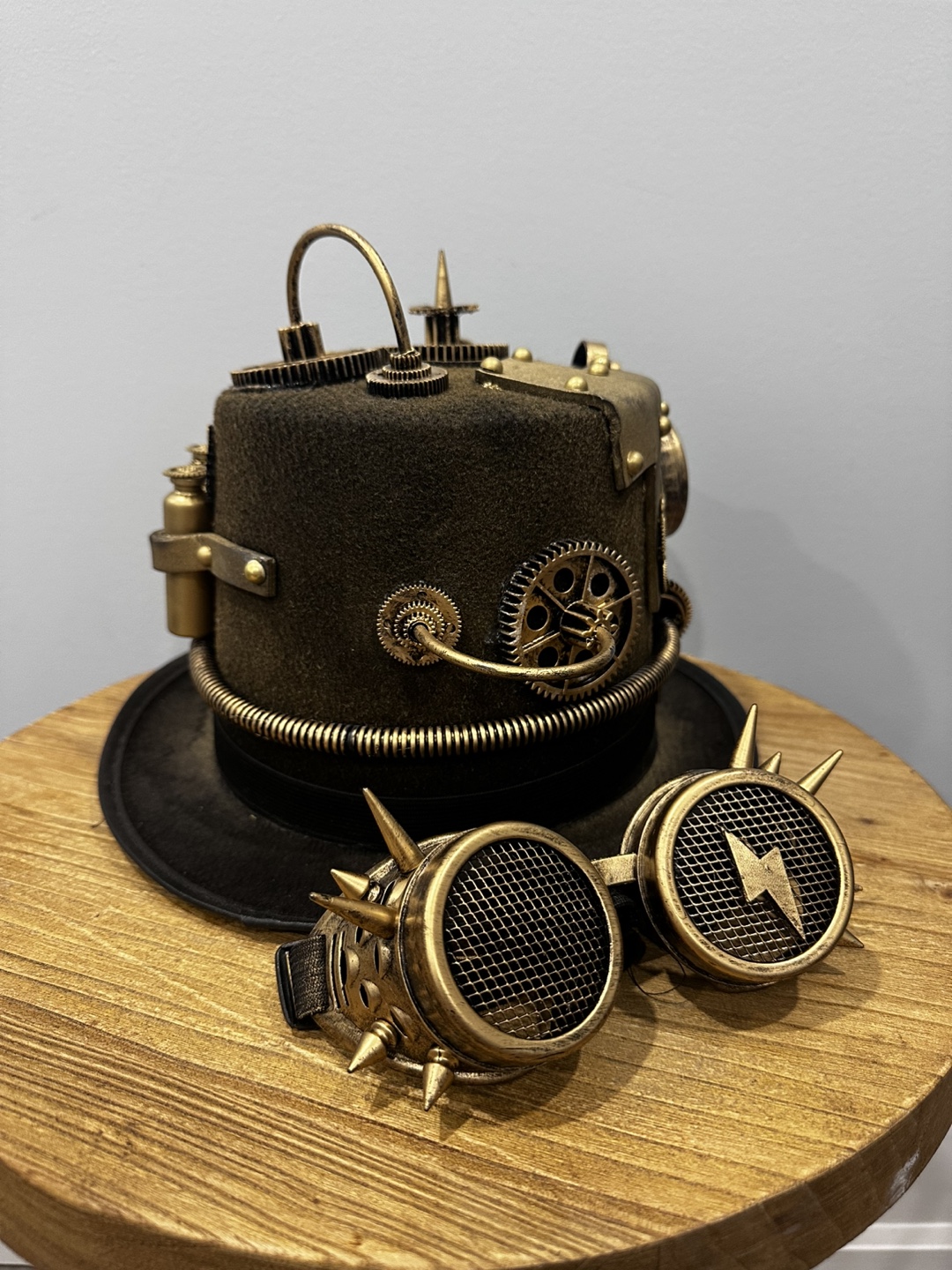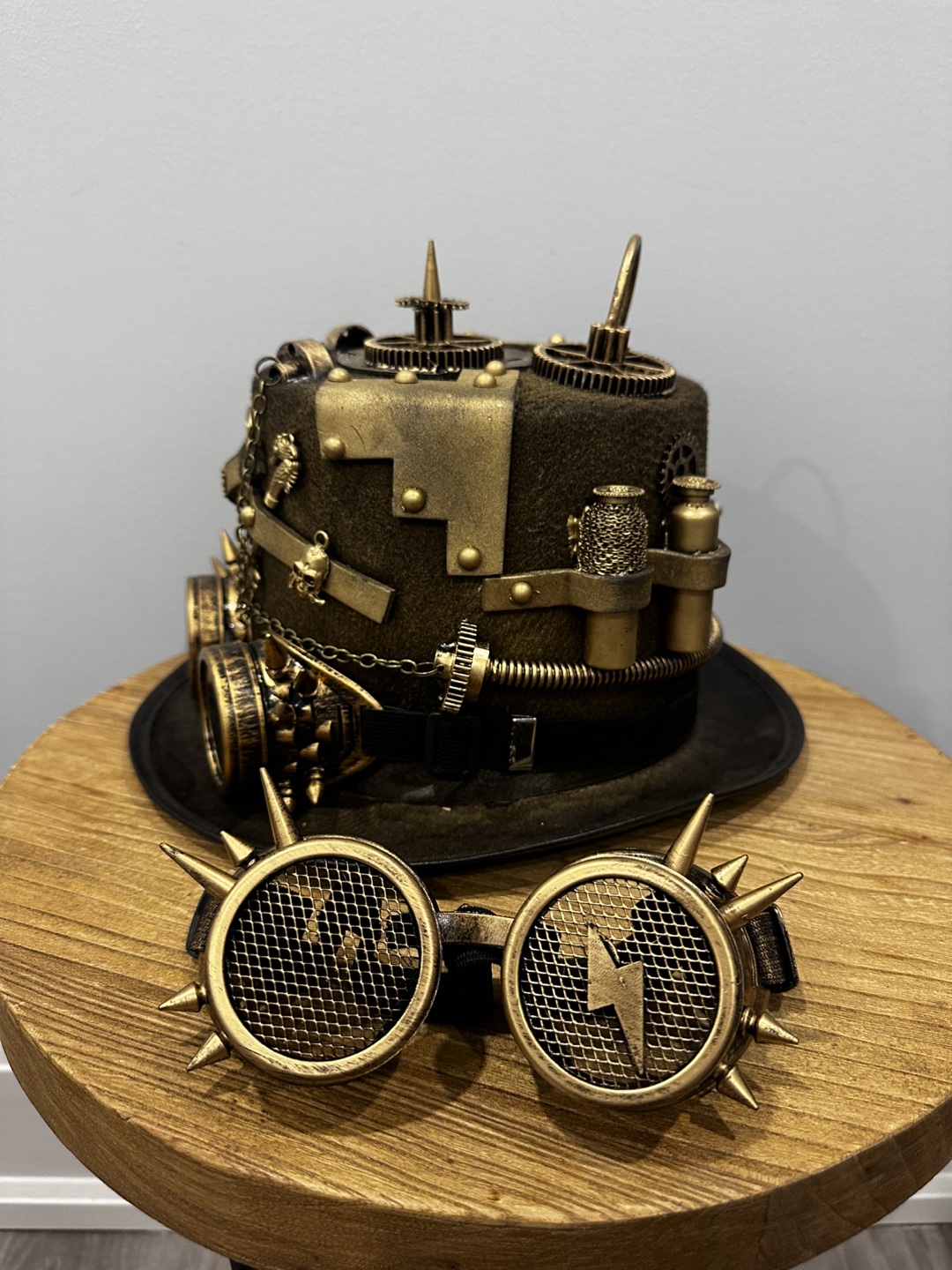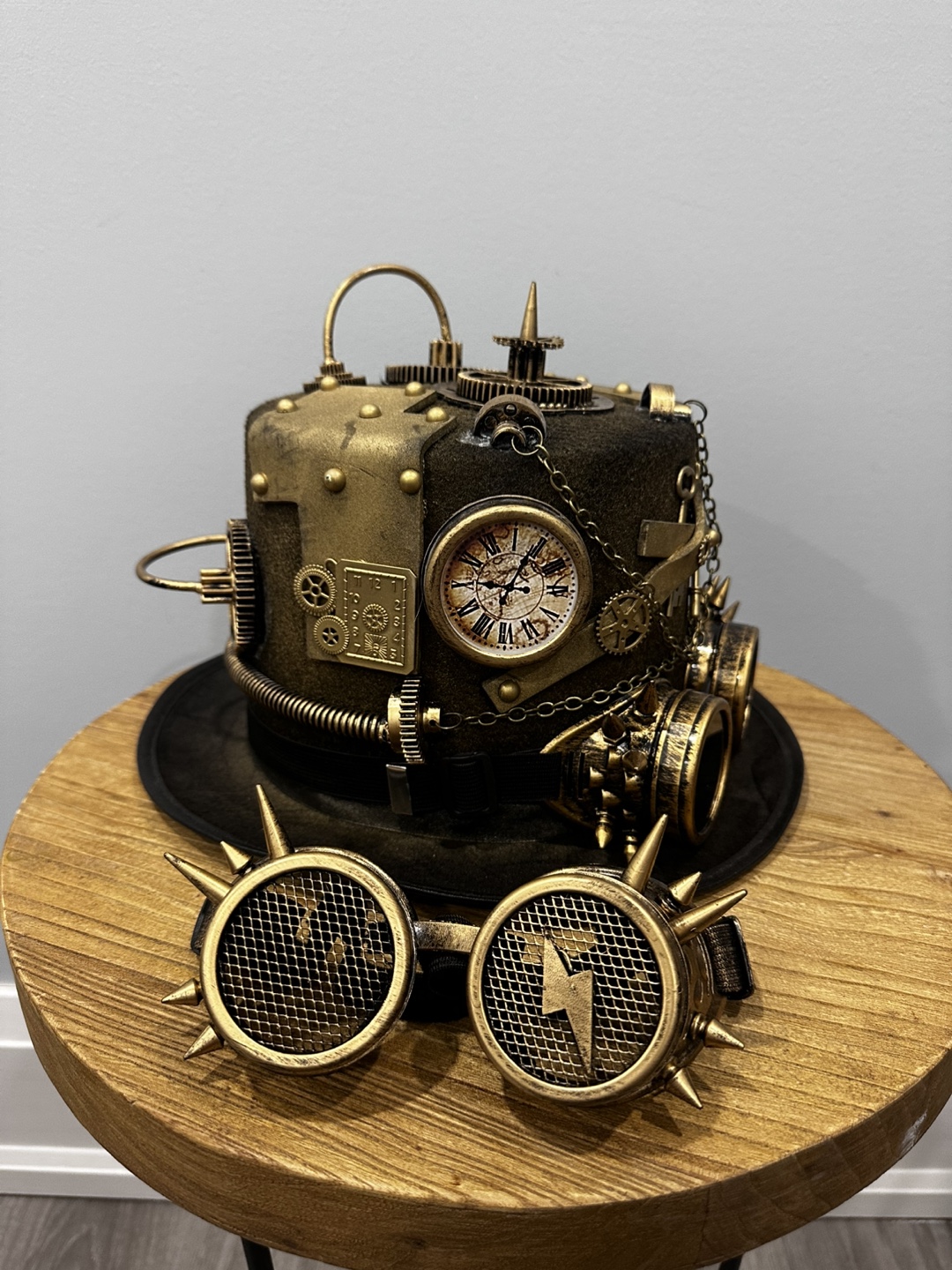 Gold steampunk top hat with attached goggles. Features various embellishments including gears, a clock, and a key. Goggles have a mesh design.
