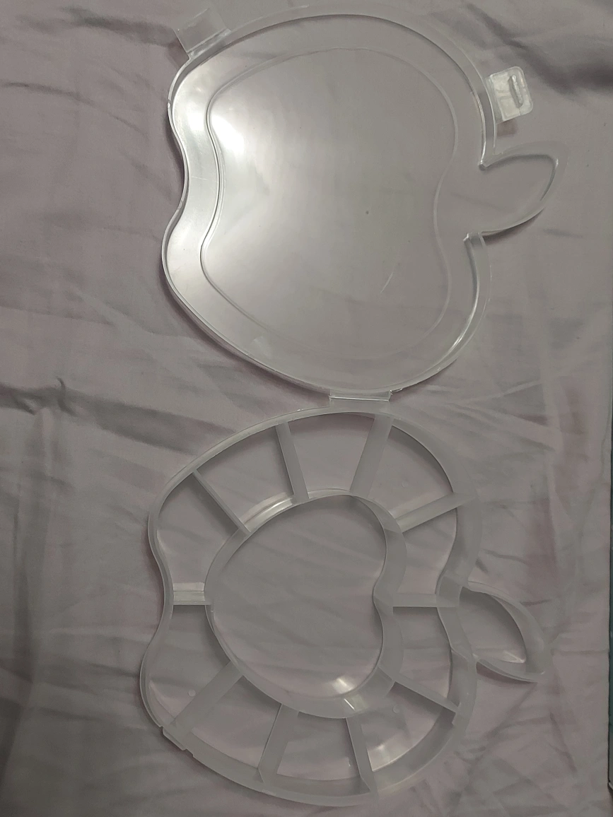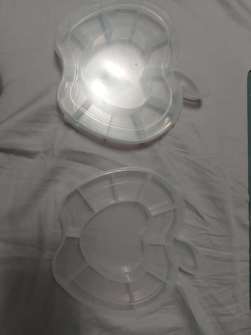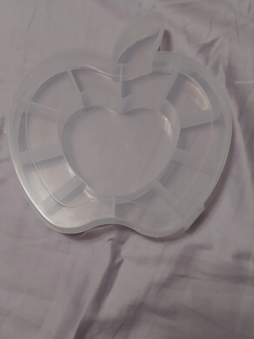 Clear plastic organizer shaped like an apple. Has 11 compartments. Perfect for organizing small items like jewellery, buttons, or craft supplies.