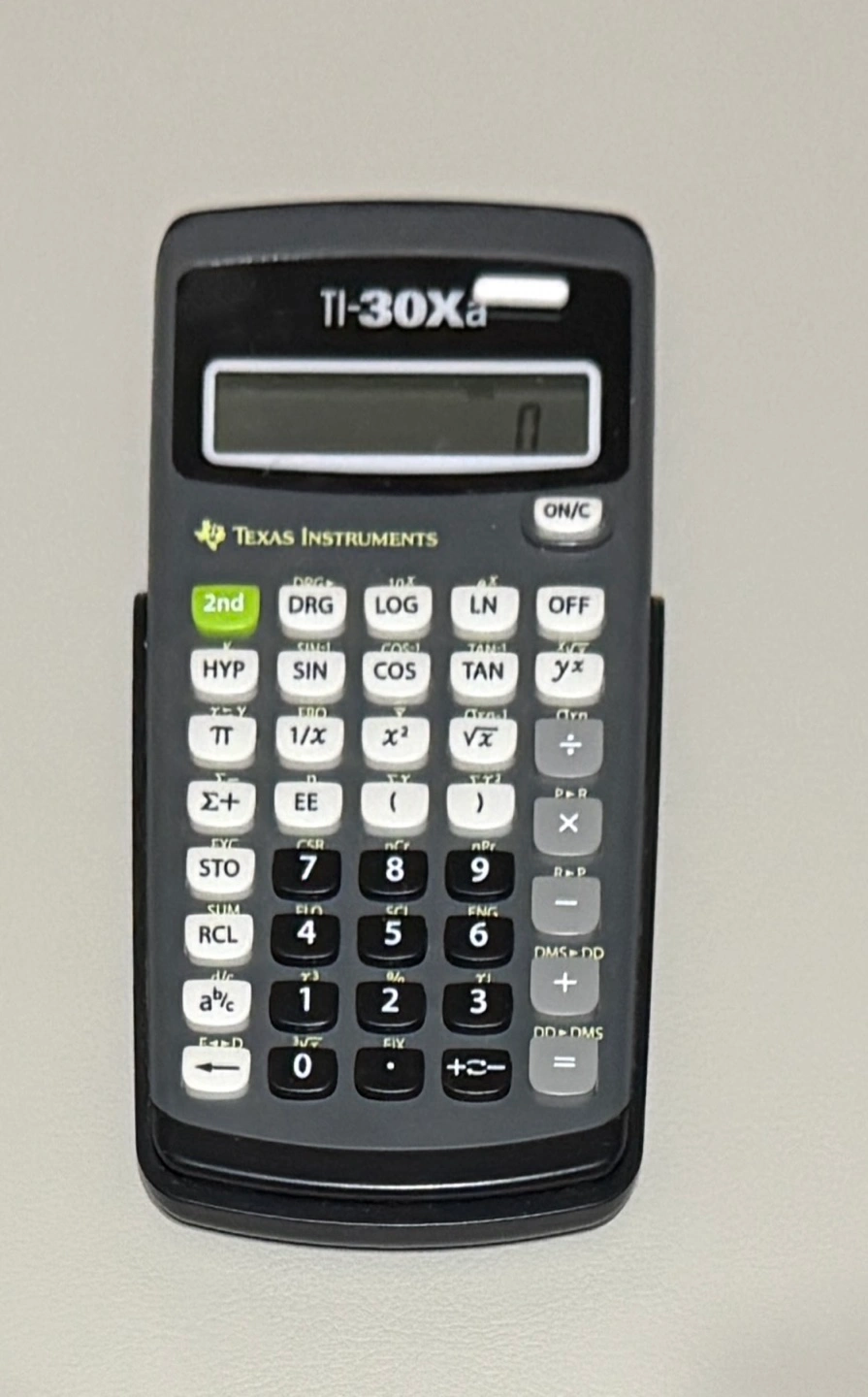 17Scientific calculator with a black and grey design. Features include trigonometric functions, logarithms, exponents, and more.