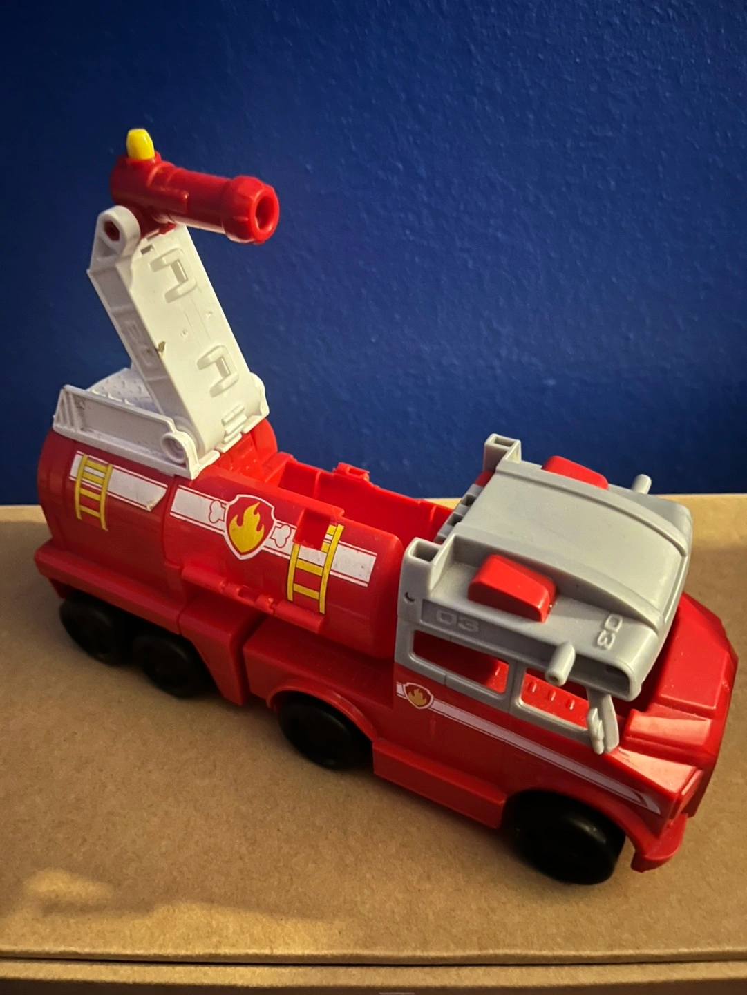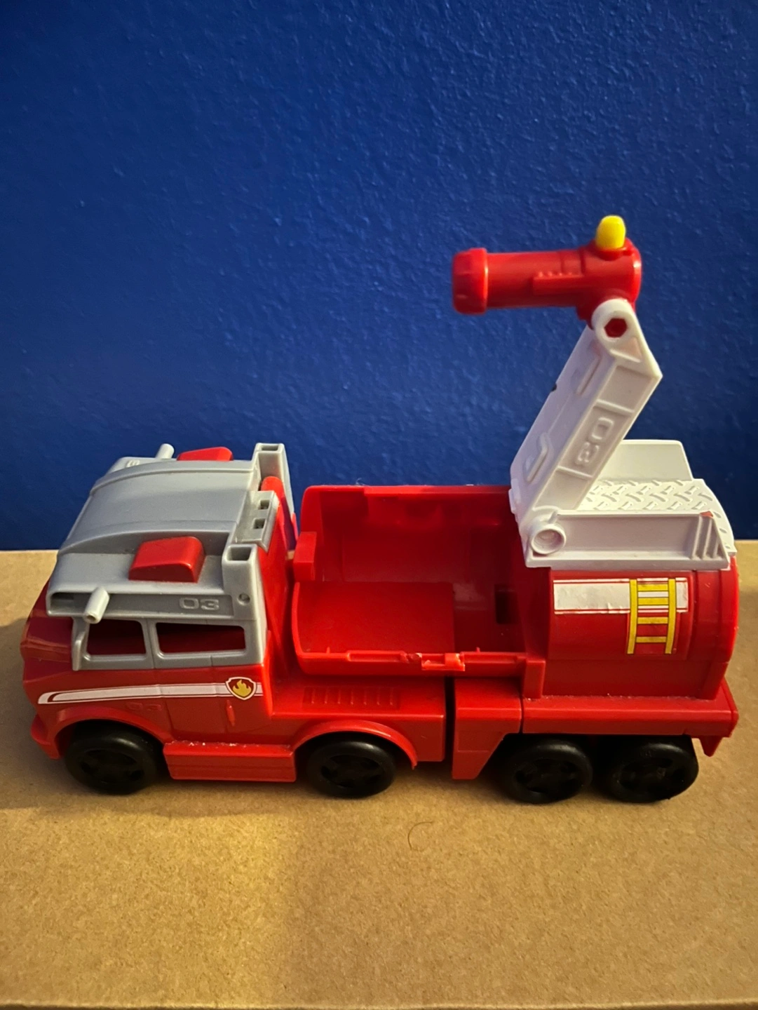 Red fire truck with working ladder and water cannon. Has a paw print on the back. Check 3 pictures one side of tank is missing still good toy has life