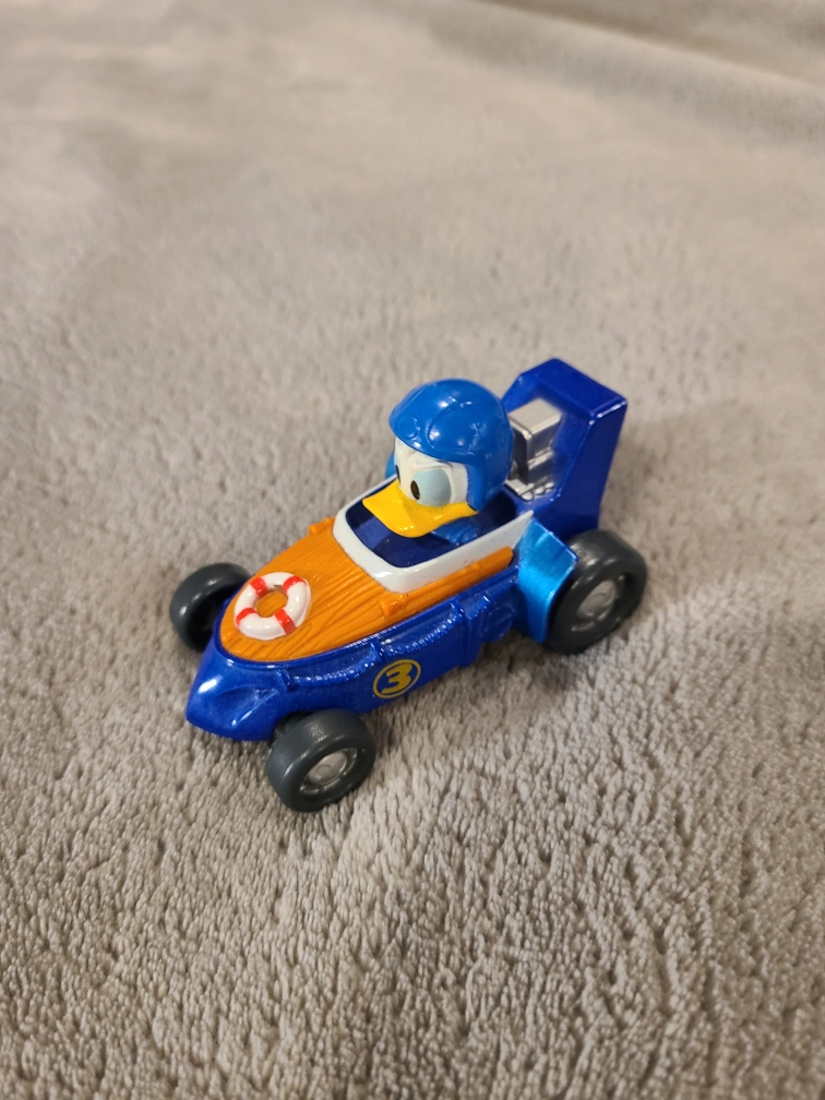 Donald Duck in a blue race car with orange details. The car has a life preserver on the front.