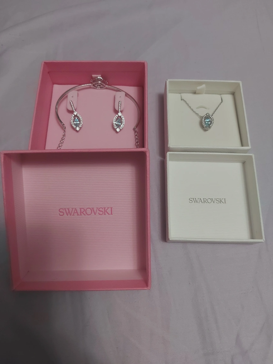 Swarovski jewelry set featuring a blue eye pendant. Includes necklace, bracelet and earrings. Each piece has a floating blue jewel.