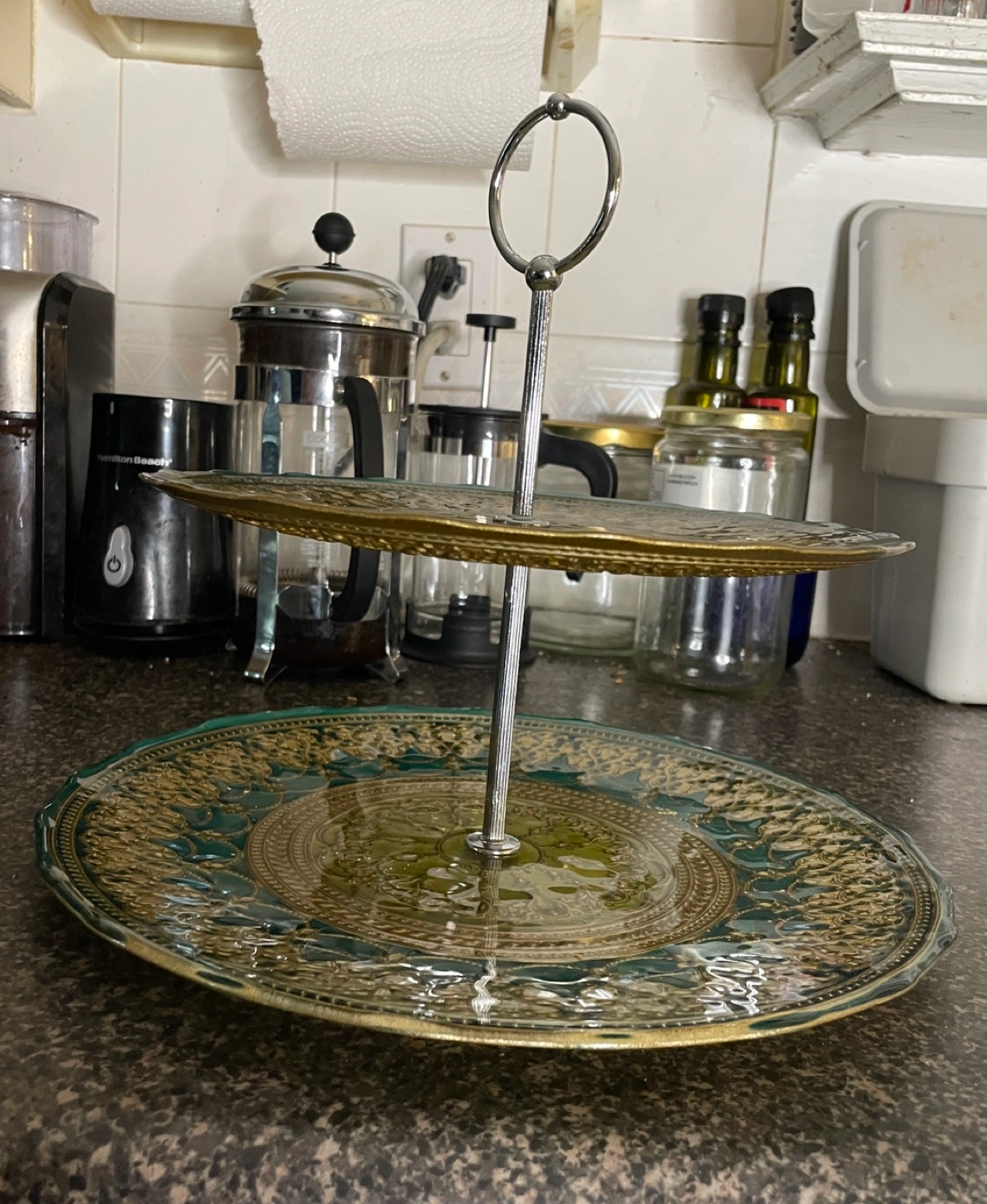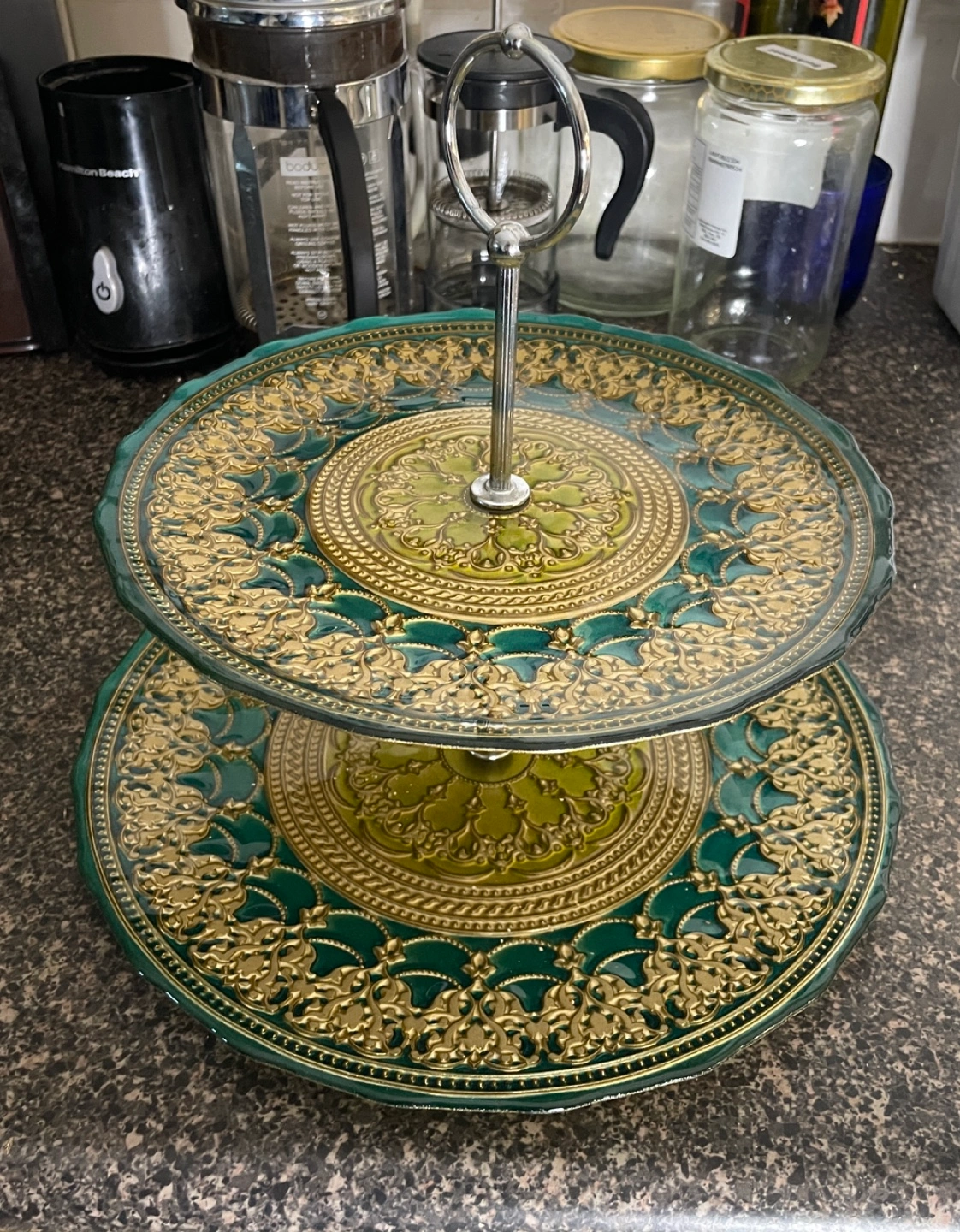 Two tier serving tray. Green and gold design. Metal stand with a ring handle. Missing its washers and one tier got broken during an event. A volunteer over tightened the screw on the middle post. Used for a couple steampunk events for cupcakes.