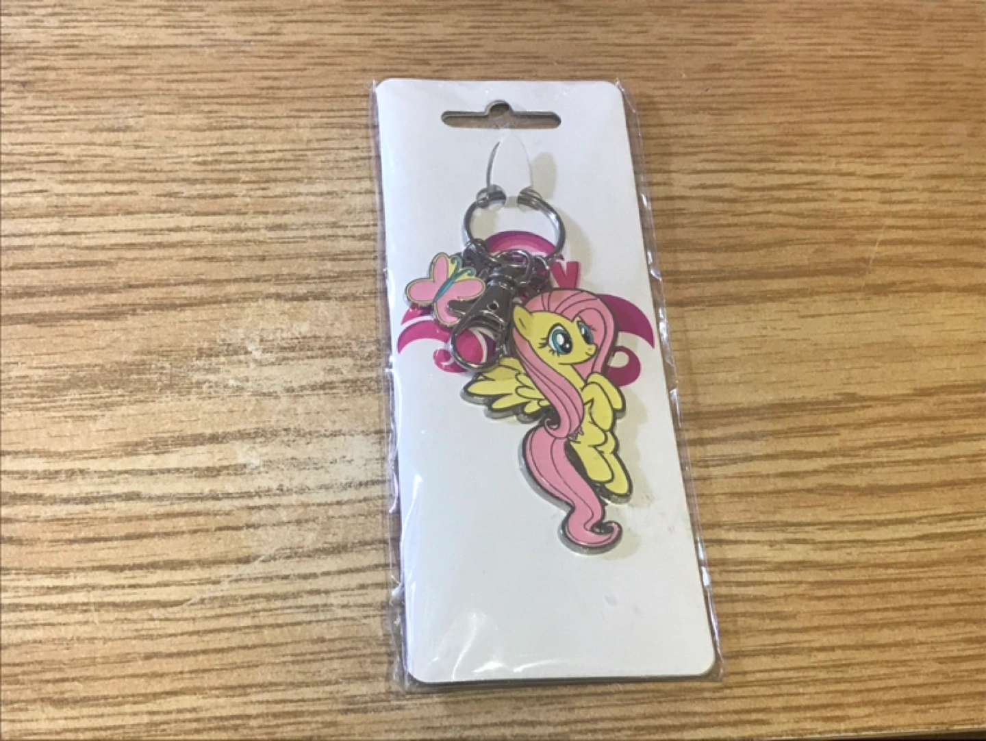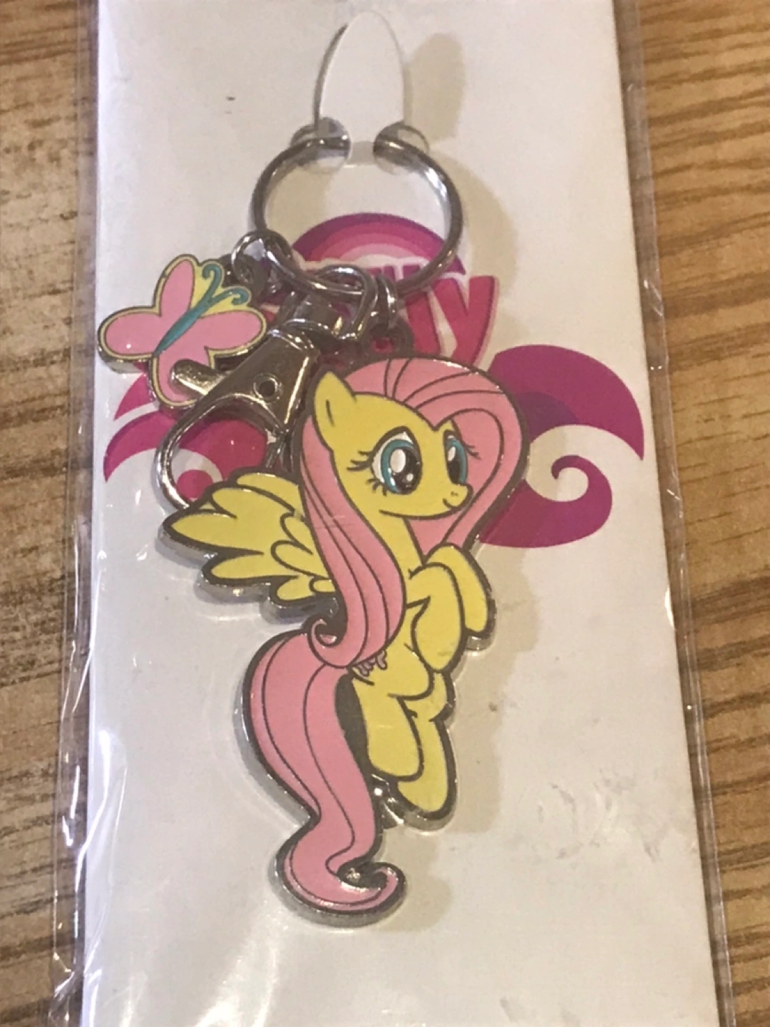 Metal keychain featuring Fluttershy from the tv series My Little Pony: Friendship is Magic, with a butterfly charm. New in packaging.
