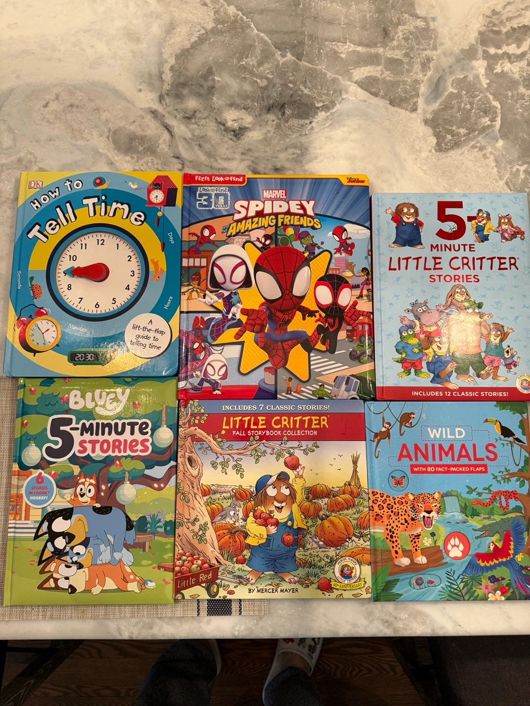 Set of 6 children's books. Titles include: How to Tell Time, Marvel Spidey Amazing Friends, 5 Minute Little Critter Stories, Bluey 5-Minute Stories, Little Critter Fall Story Book collection m, and Wild Animals