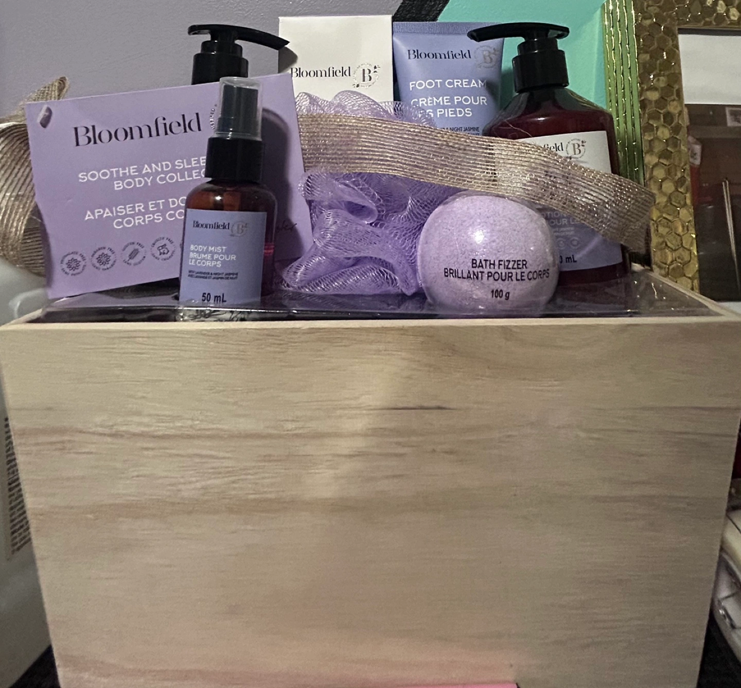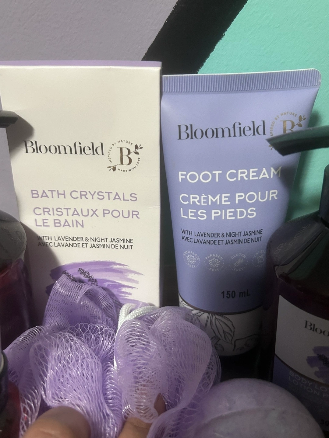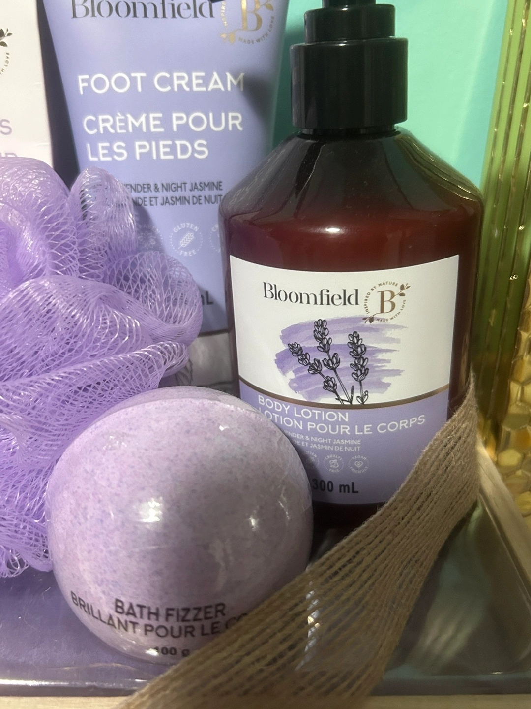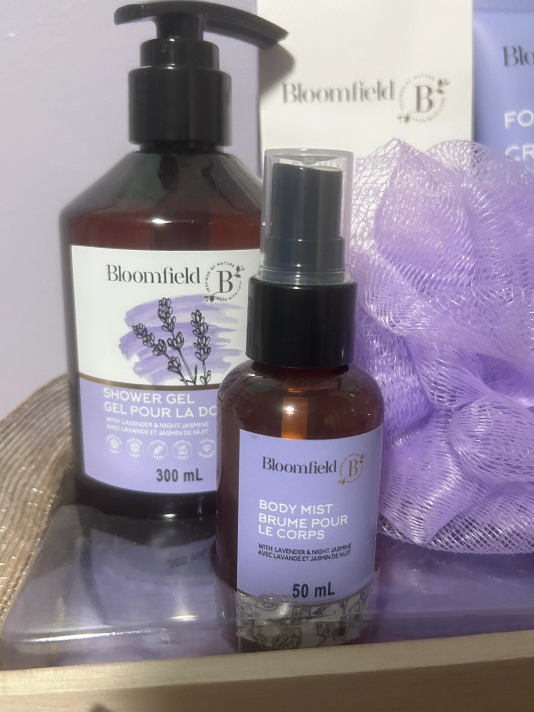 Gift set includes shower gel, body mist, foot cream, body lotion, bath crystals and a bath fizzer. Lavender and Night Jasmine scent.