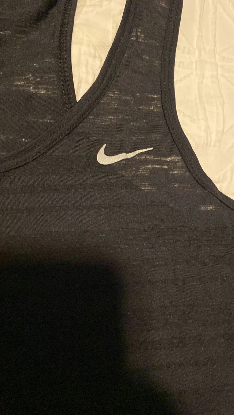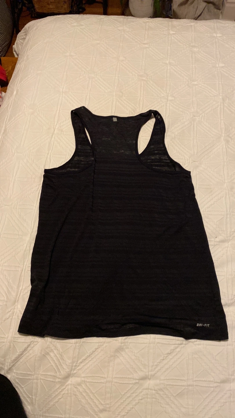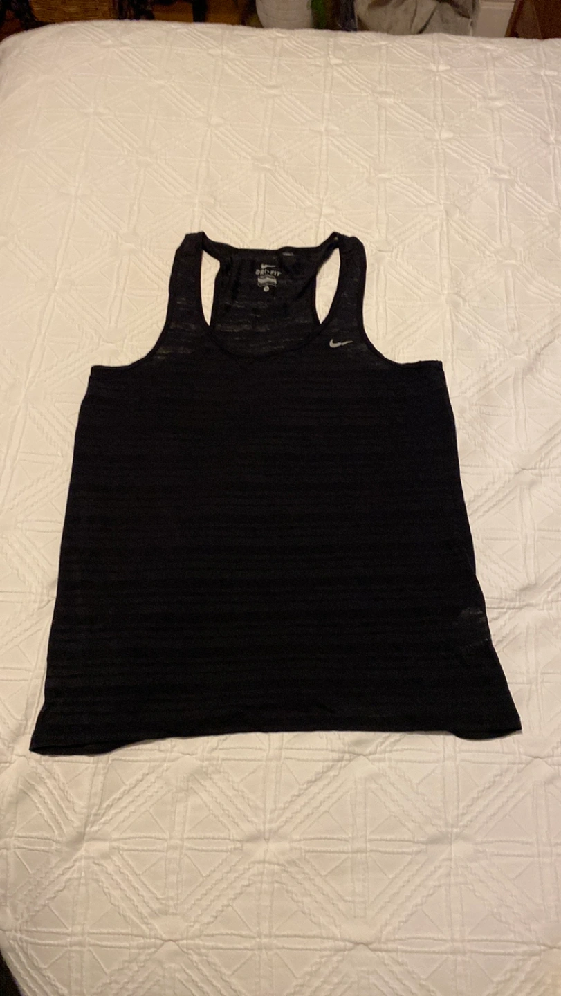 Nike, size medium tank top. Pattern is sheer intermittently so I would suggest a sports bra underneath. EUC. Wicking fabric. Washable.