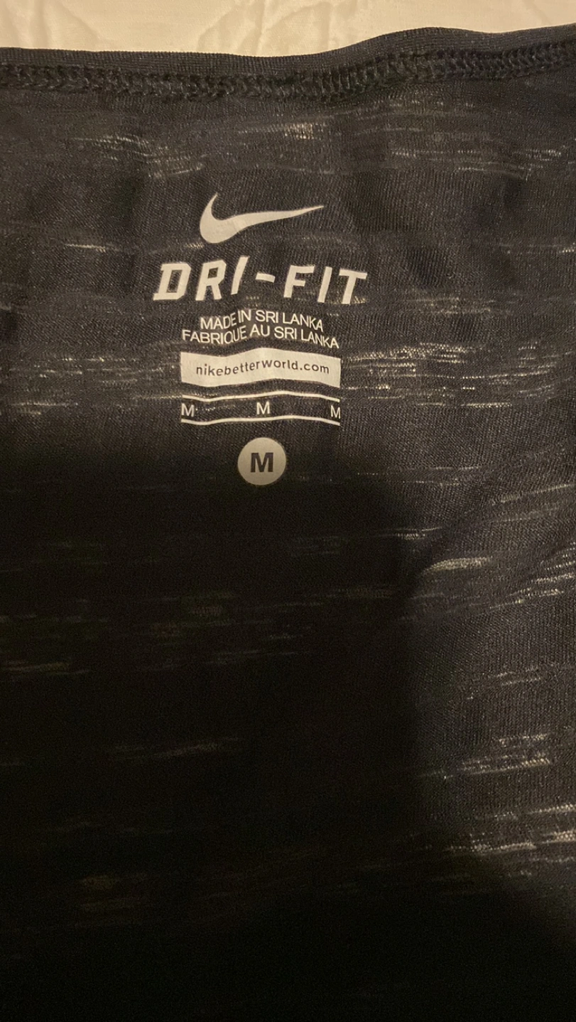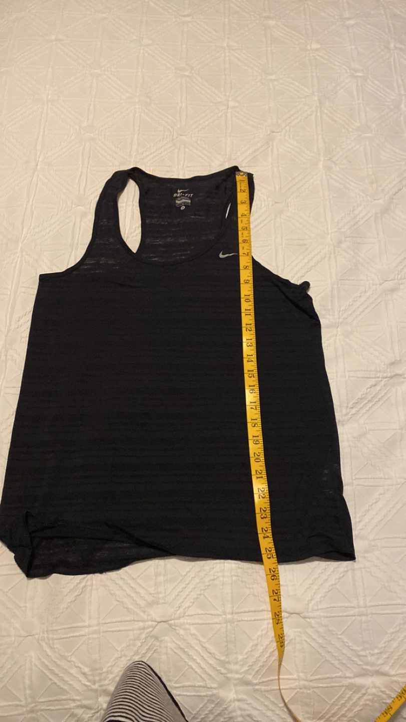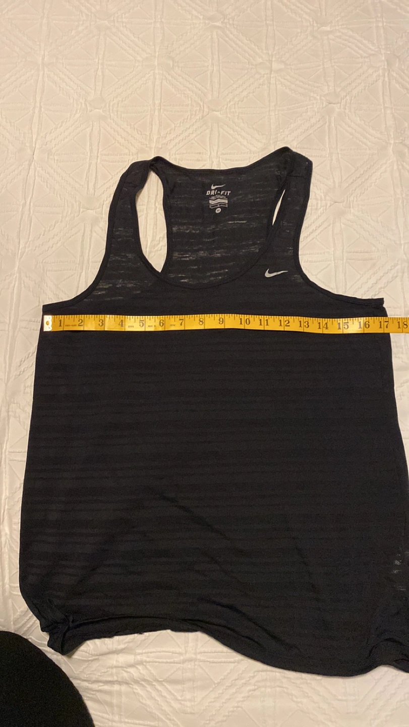 Nike, size medium tank top. Pattern is sheer intermittently so I would suggest a sports bra underneath. EUC. Wicking fabric. Washable.
