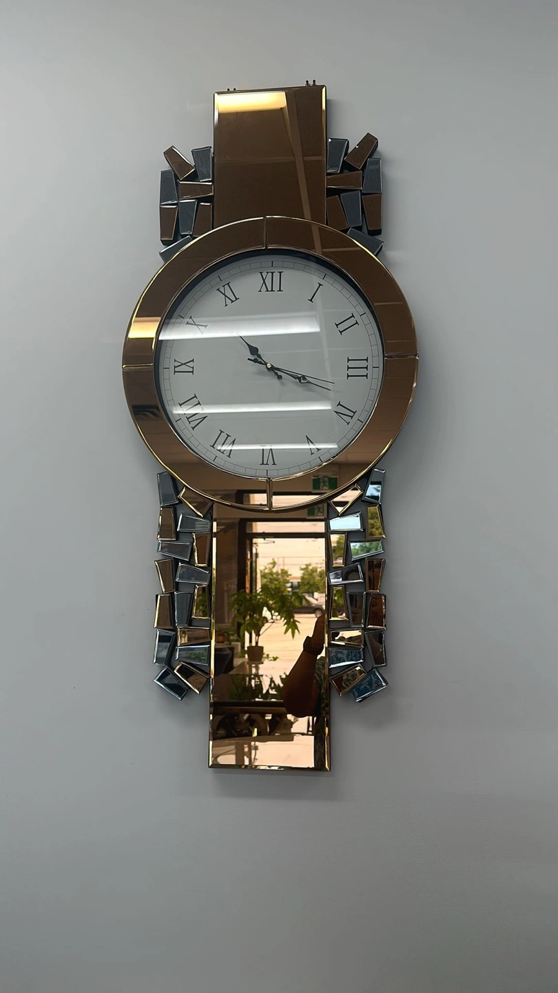 Large, mirrored wall clock with gold accents. Comes with a battery operated clock mechanism. The clock is in good condition with minor signs of wear.