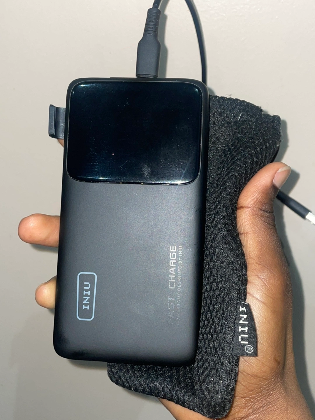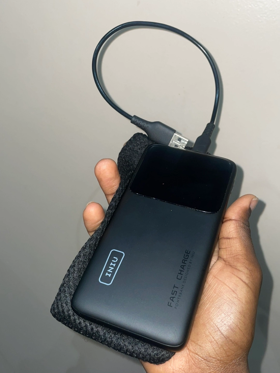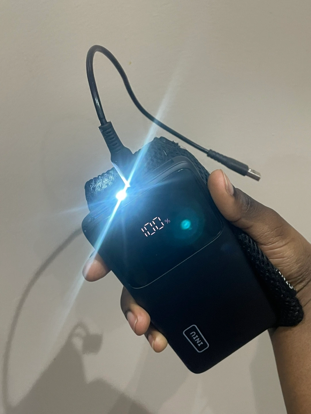 Solid power bank with a built-in flashlight, a digital display, and works as a mini phone stand. 10,000mAh & can charge 2 devices.
