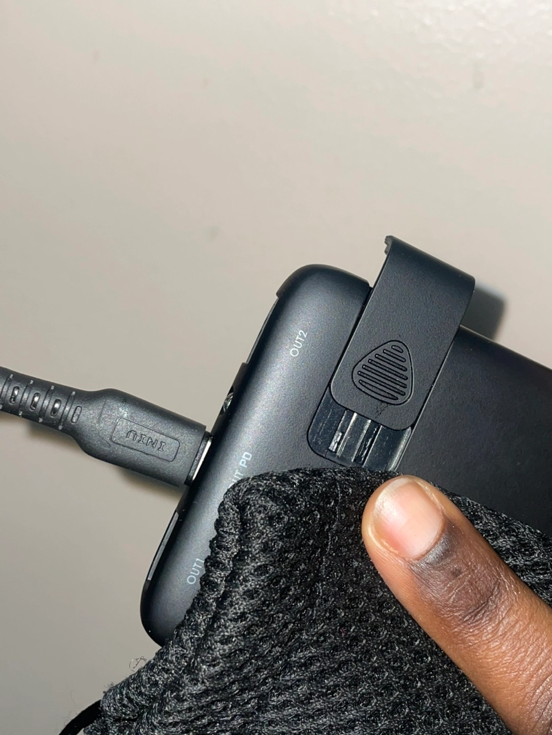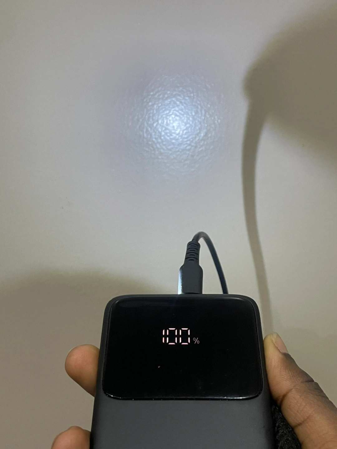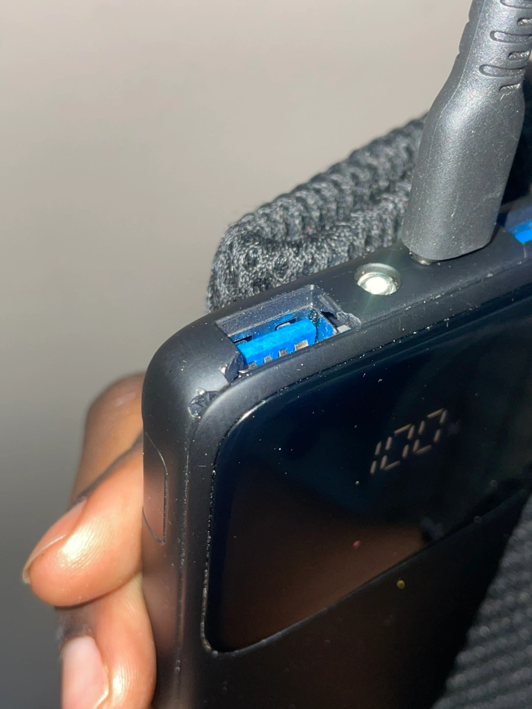 Solid power bank with a built-in flashlight, a digital display, and works as a mini phone stand. 10,000mAh & can charge 2 devices.