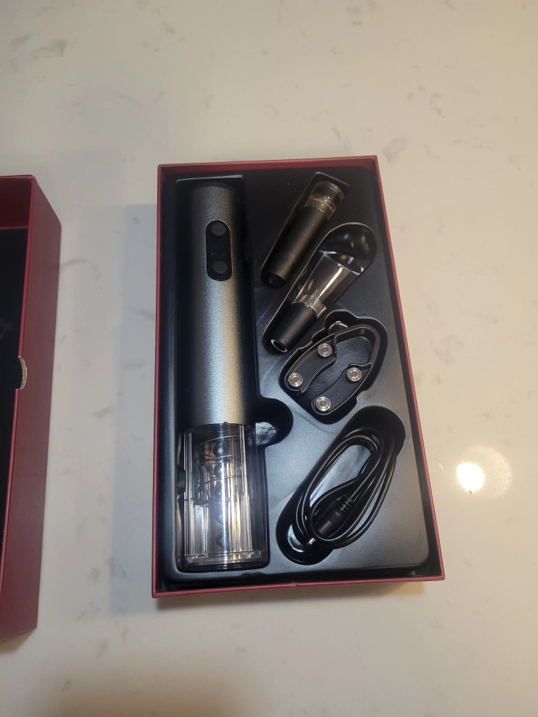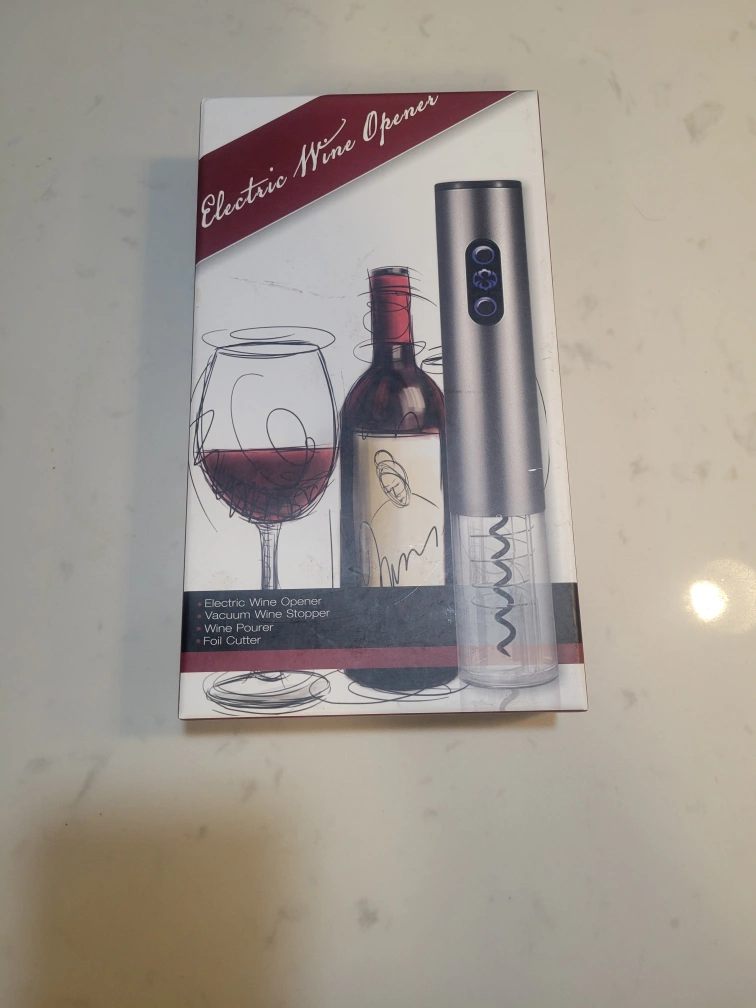 Electric wine opener, includes vacuum stopper, pourer, and foil cutter. Comes with USB charger. First come, first serve