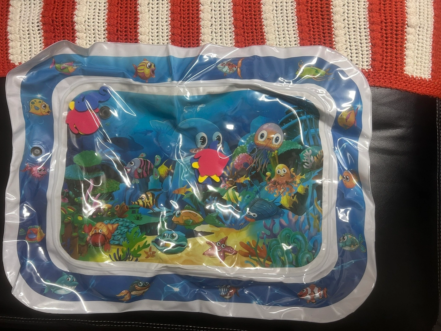 Inflatable mat with an ocean theme. Features a variety of sea creatures and has a clear top for water play.