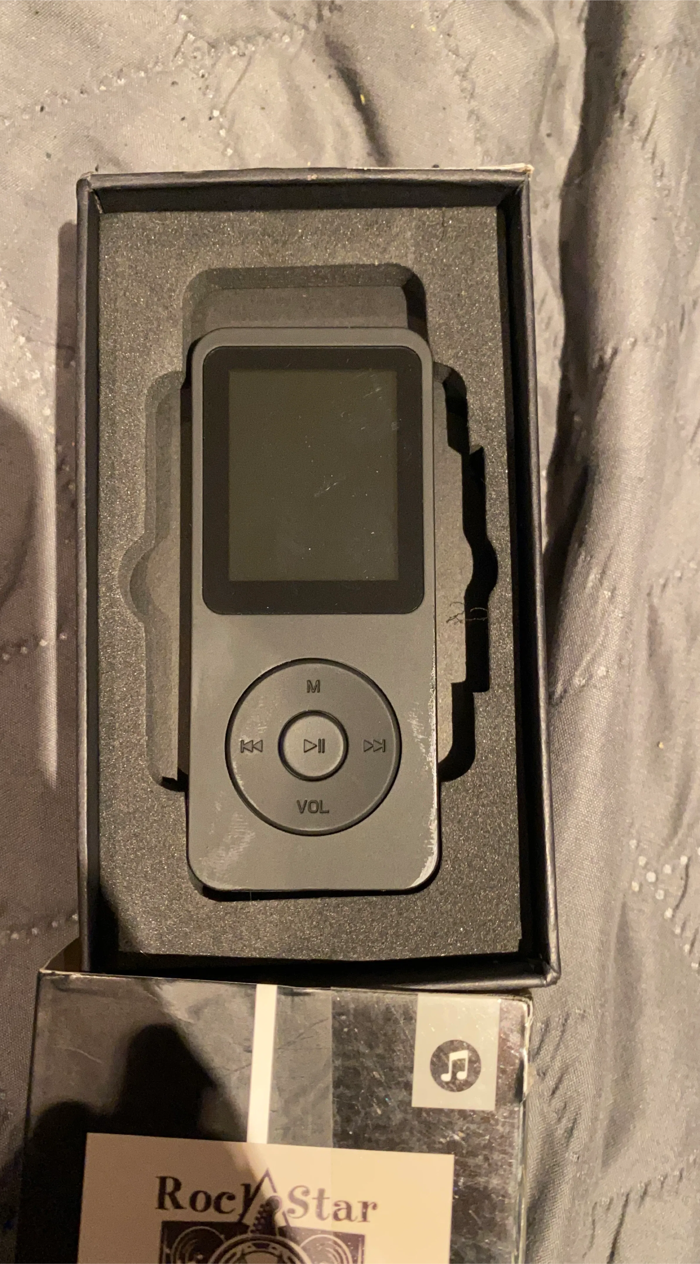 This is a Rockstar MP3 player in grey. It's a portable music device that fits in your pocket. It comes with a reset button and a USB-C charging port.
