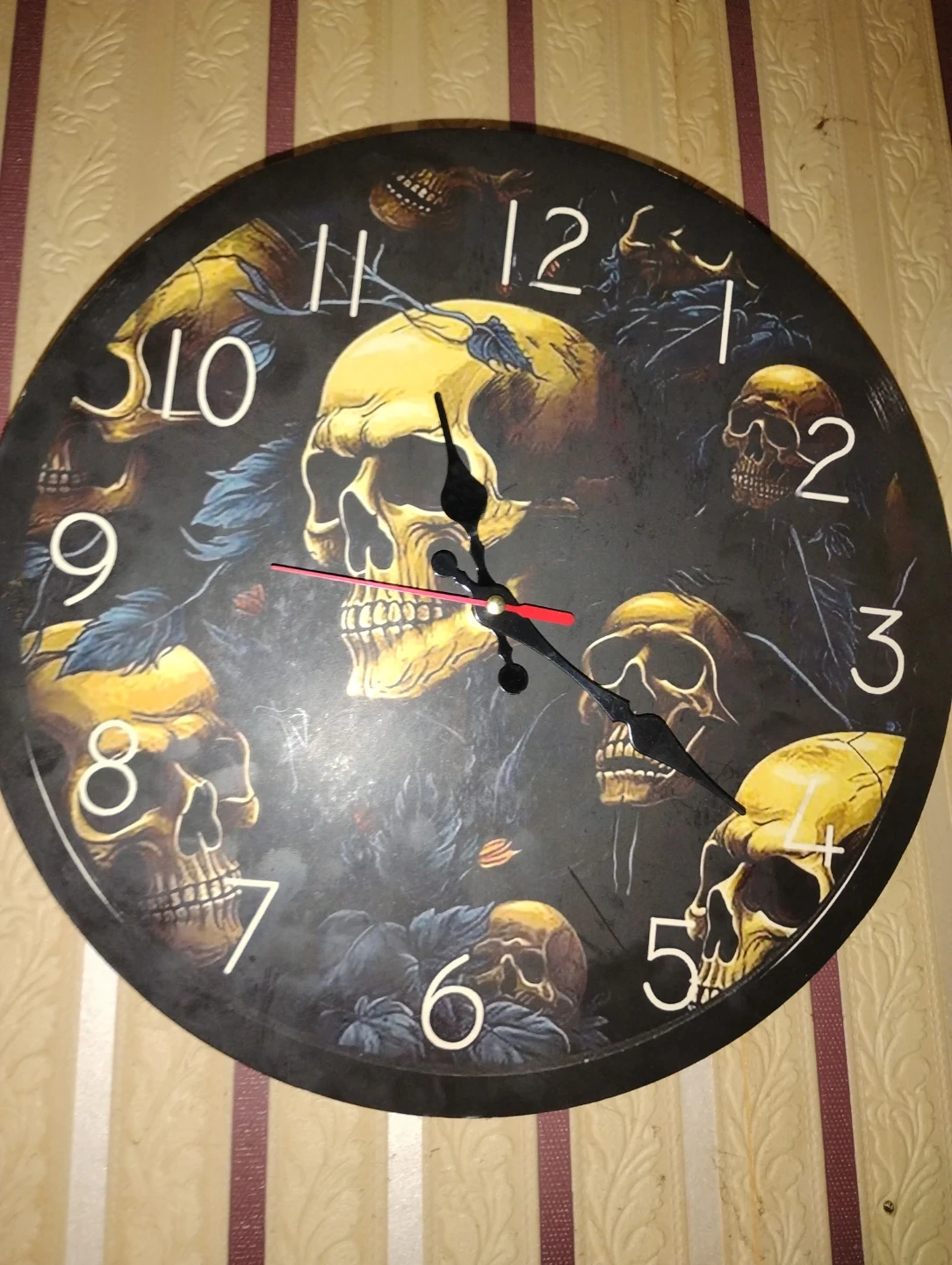 This round wall clock features a spooky design with multiple yellow skulls and dark foliage. It has classic hour markers and black clock hands, with a red second hand. It's a unique statement piece for any room!