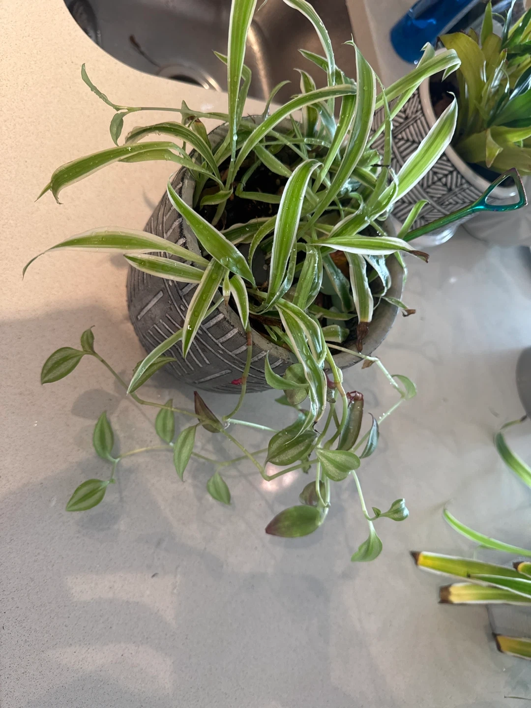 Spider plant in a grey decorative pot. It's a healthy plant with lots of new growth. Includes a small iridescent mini shovel. Pot has a textured geometric pattern.