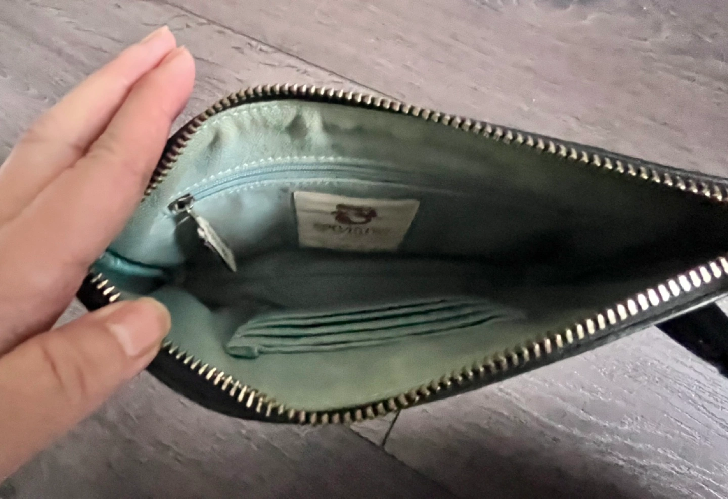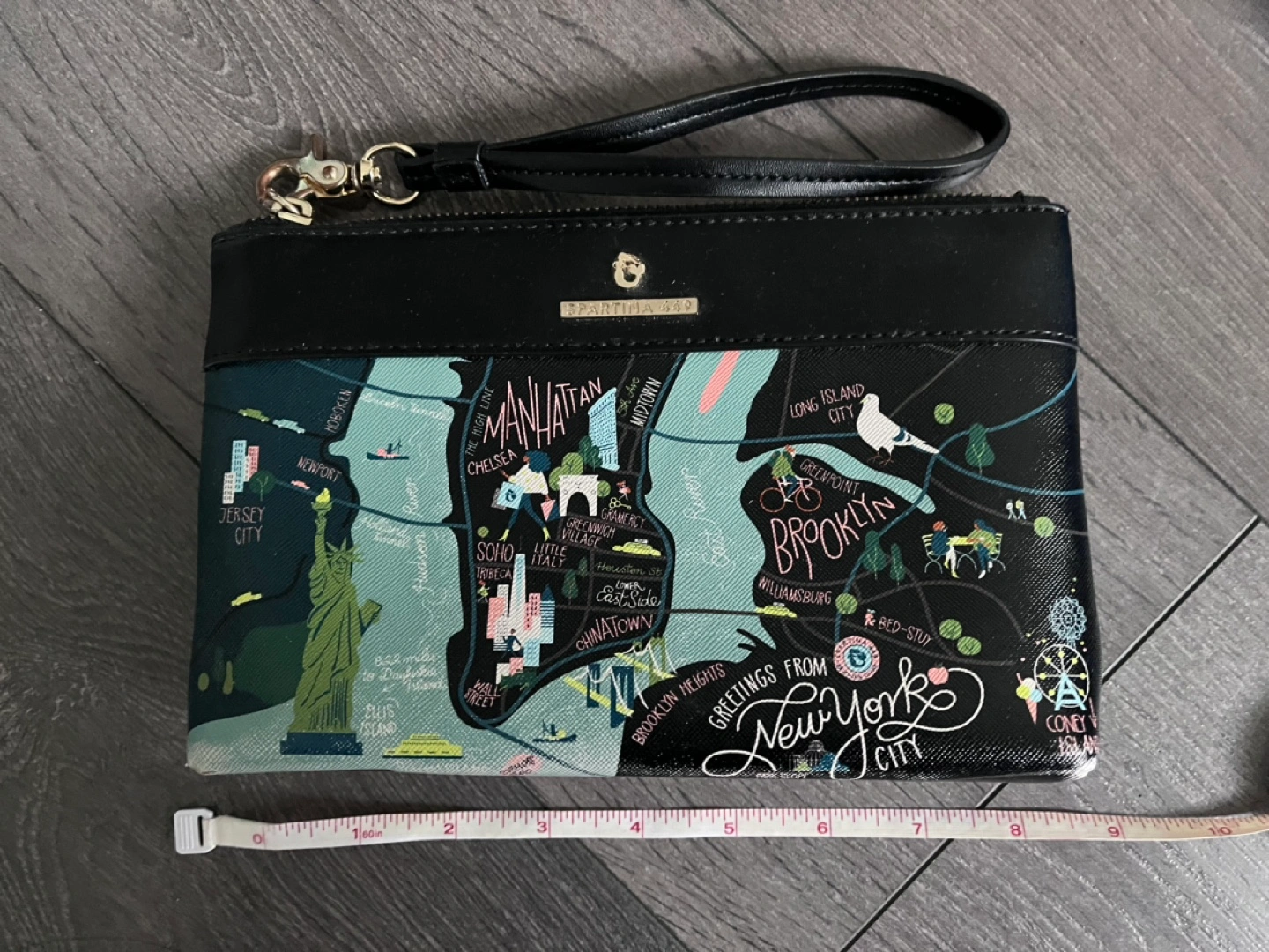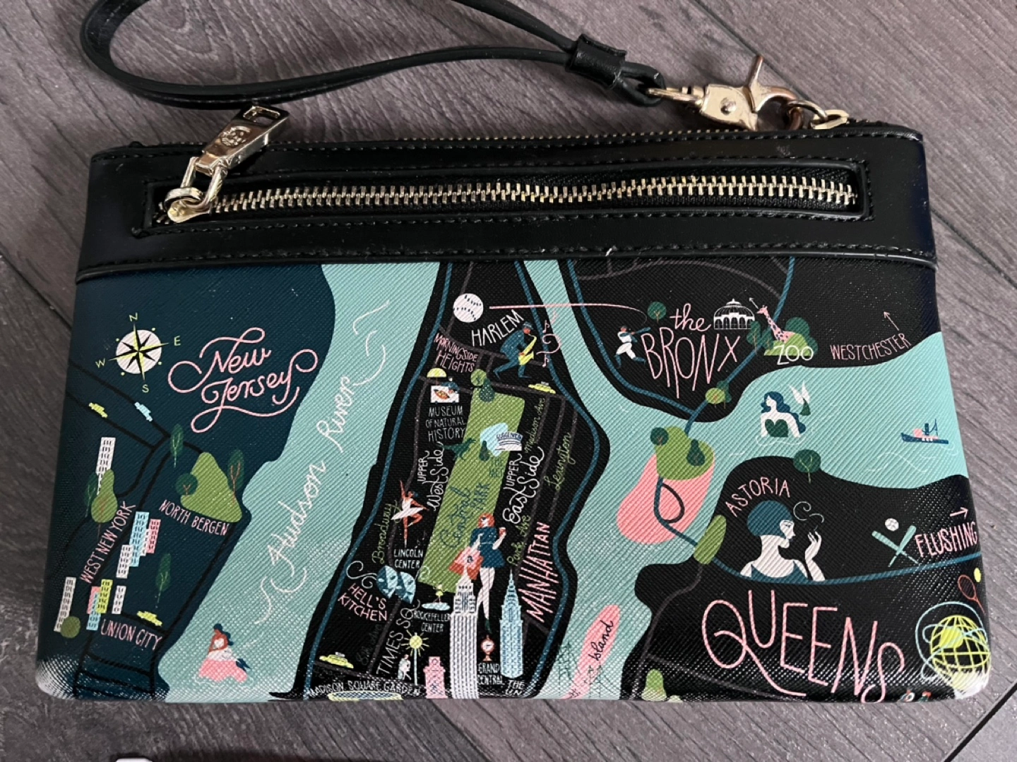 Black faux leather clutch with a map of New York City. Has a zipper closure, wrist strap, and inside pocket. Reg price $54 It's the wristlet for all adventures! Whether you're shopping downtown or exploring a new city, the Scout Wristlet is your go-to accessory. This wristlet features a detachable leather strap, exterior zip pocket, and top zip closure. Zip it open and find four slip pockets for your credit cards & ID and a zip pocket for your lipstick. Put your sunnies and other knick-knacks in the middle and you're ready to go! https://spartina449.com/products/new-york-city-scout-wristlet?variant=43473677189350