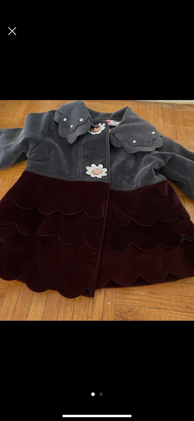 Grey and burgundy velvet jacket with scalloped hem and a flower embellishment on the front. The jacket is in good condition and has been gently used.