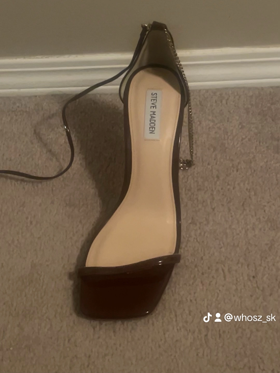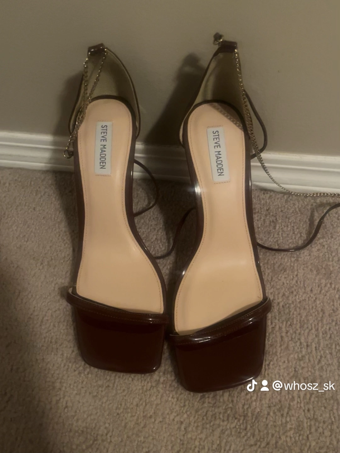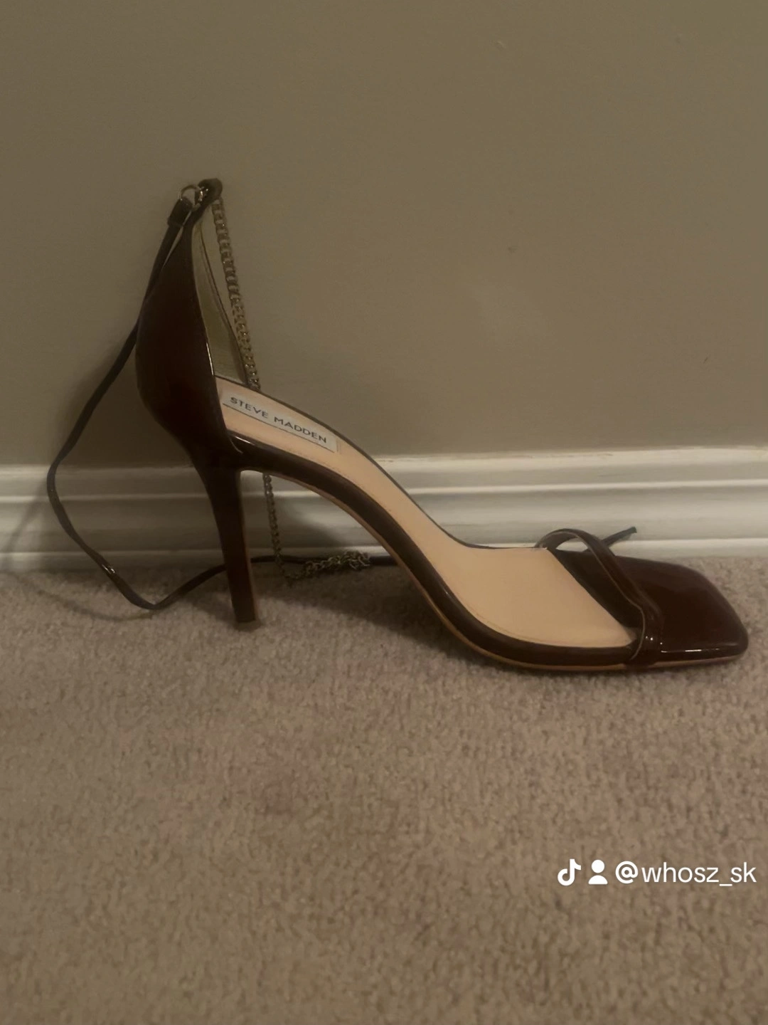 Burgundy heels with a square toe and ankle strap. Features a chain detail on the ankle strap. Doesn’t come with original box and missing other strap