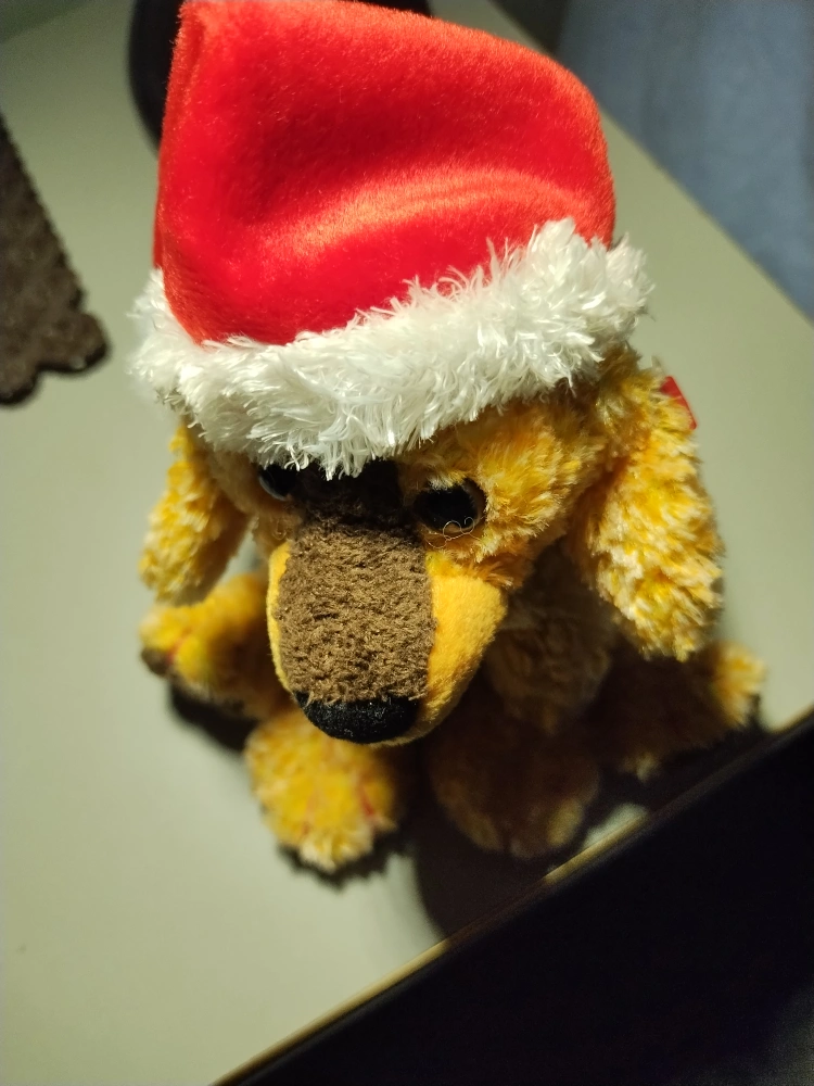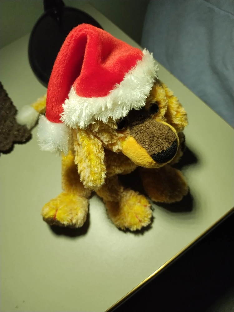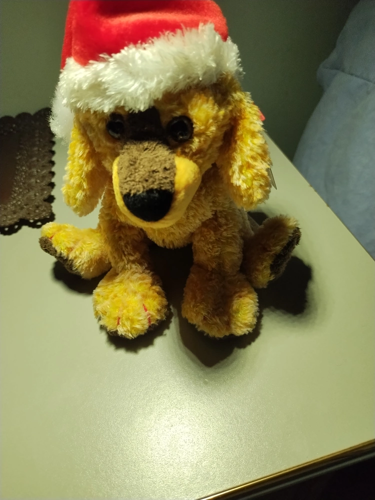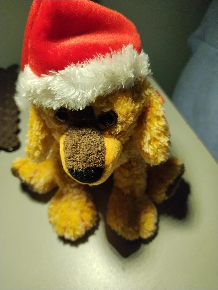 Yellow and brown plush puppy wearing a red Santa hat. Beanie Babies tag is still attached.