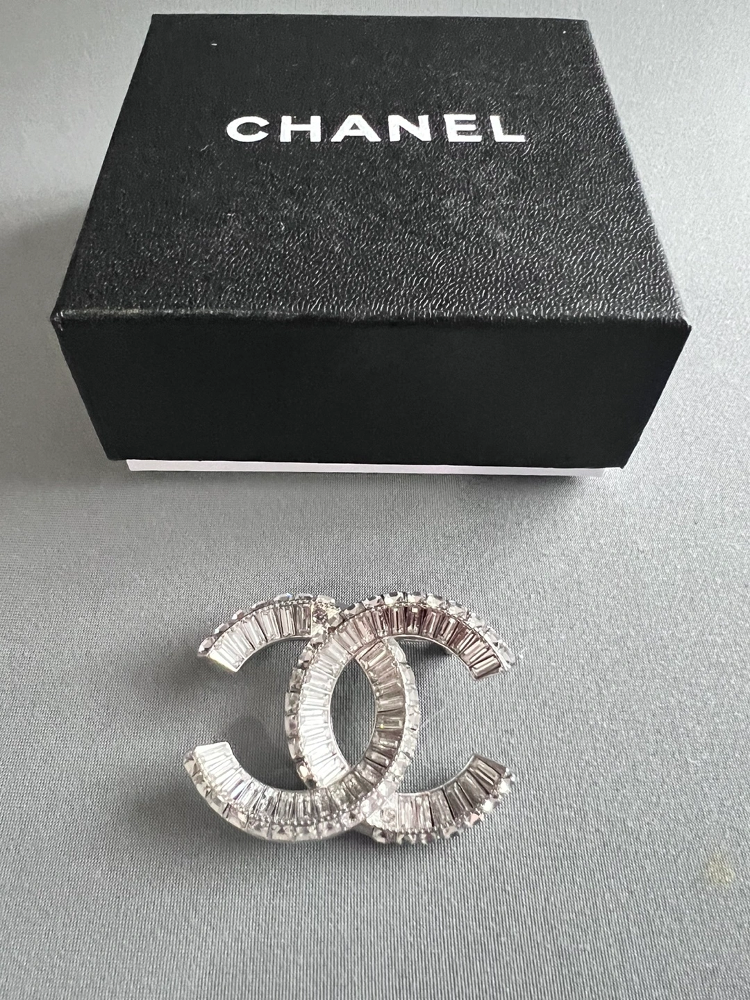 Large, silver-toned brooch featuring the iconic interlocking CC logo, encrusted with clear crystals. Comes with box.